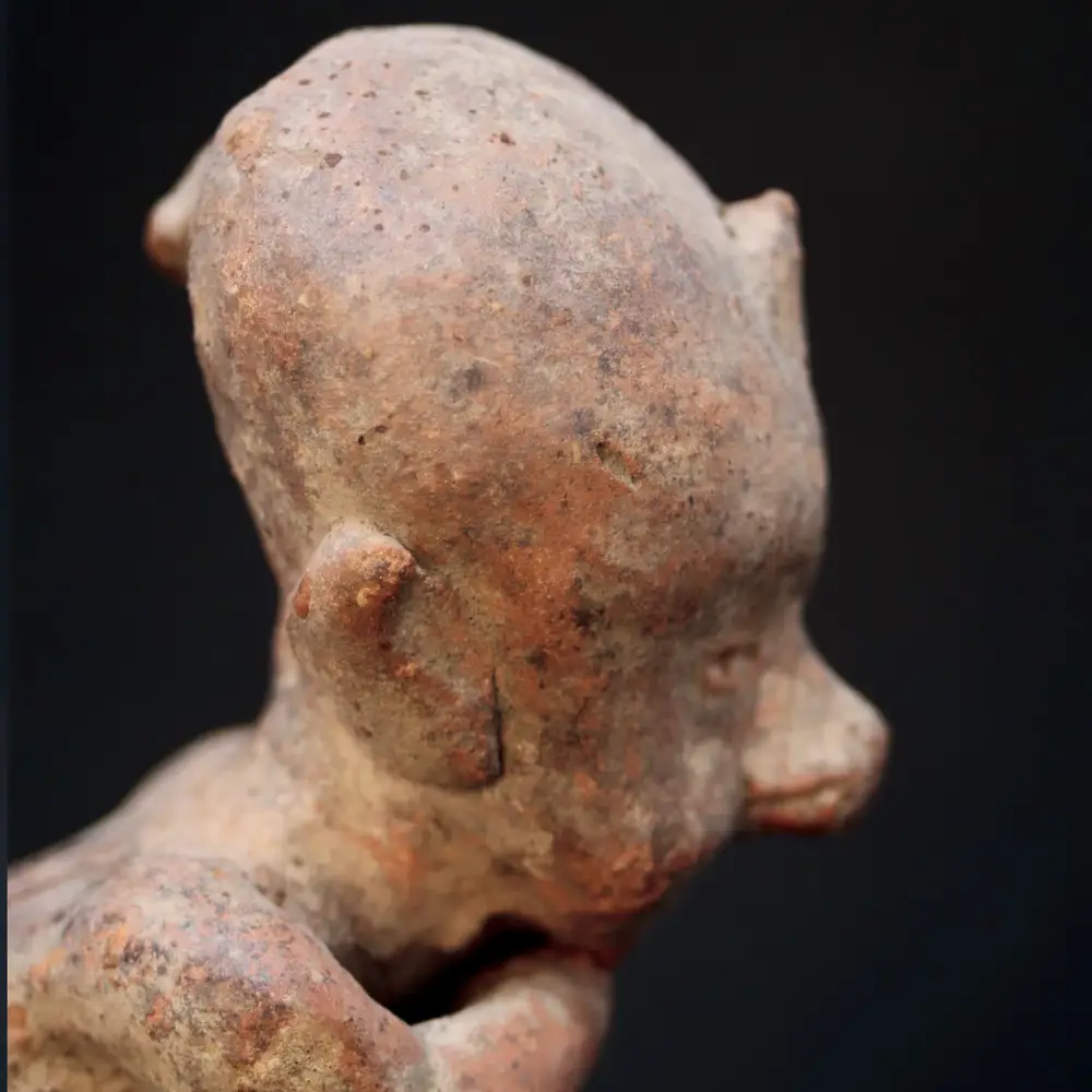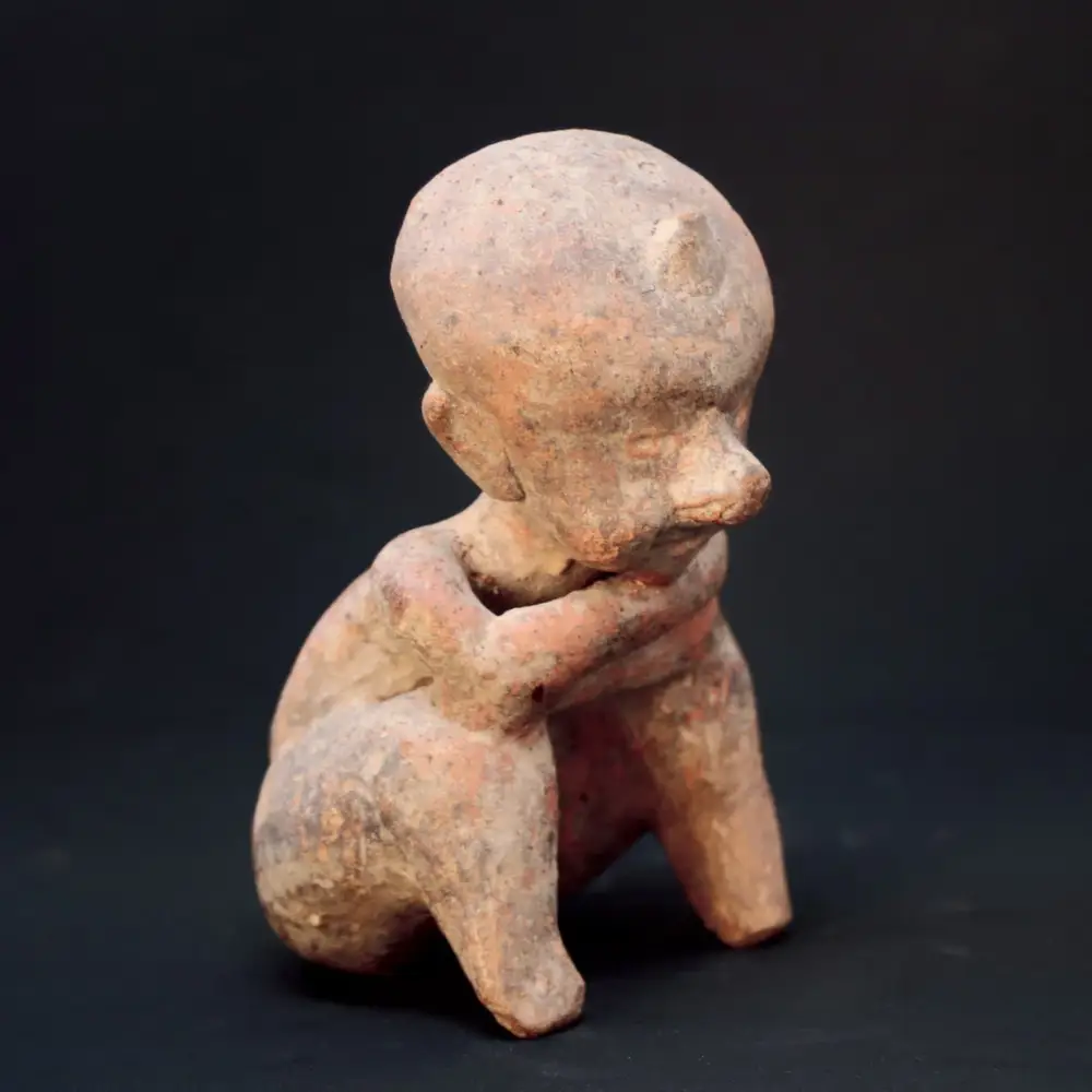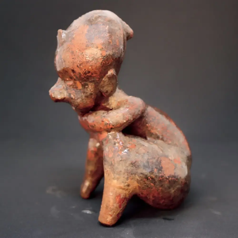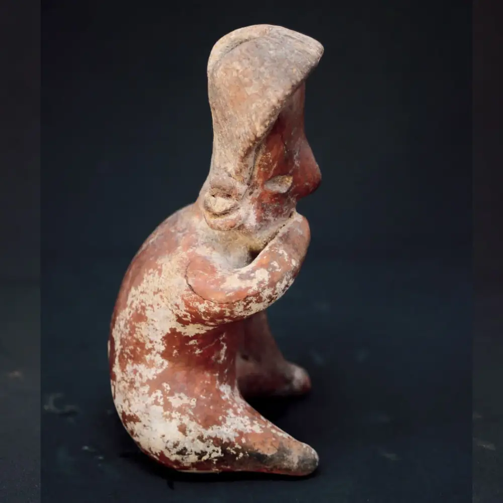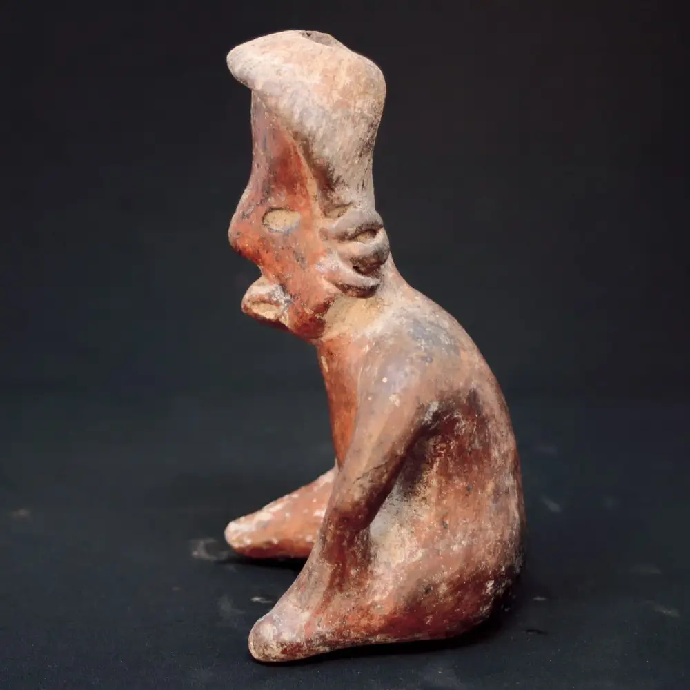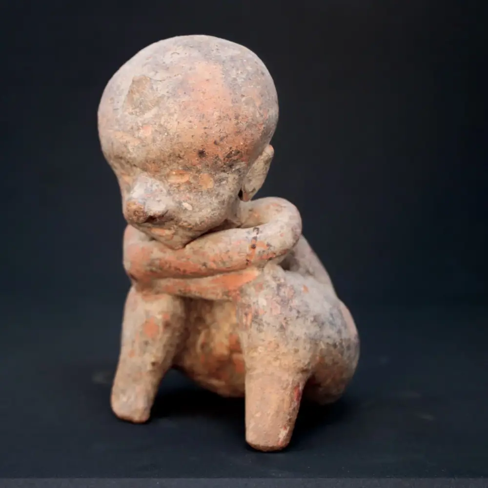 Figurilla hueca. Vista lateral. Encontrada en un contexto funerario. Figurilla femenina en forma sedente con la cabeza y los brazos recargados sobre la rodilla izquierda. Es muy notoria la deformación craneal y los adornos de concha que lleva sobre la nariz y la oreja (orejaras y narigueras). La figurilla está desnuda y solo porta cinturón y se aprecian restos de pintura facial y corporal.