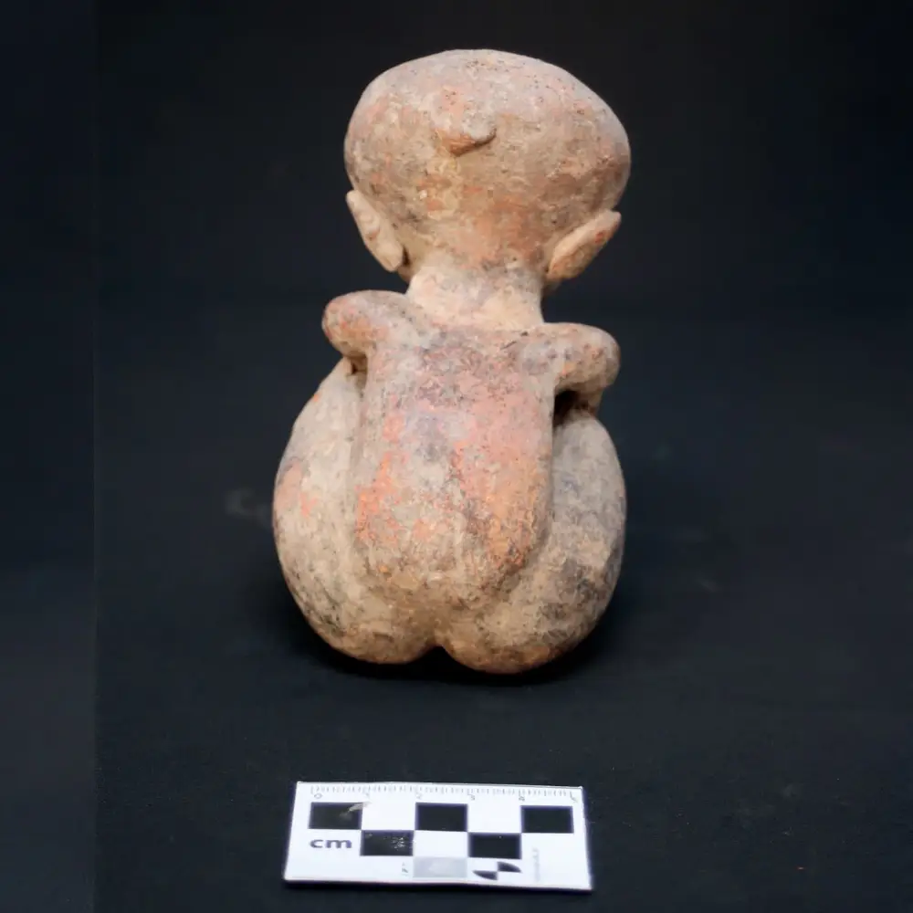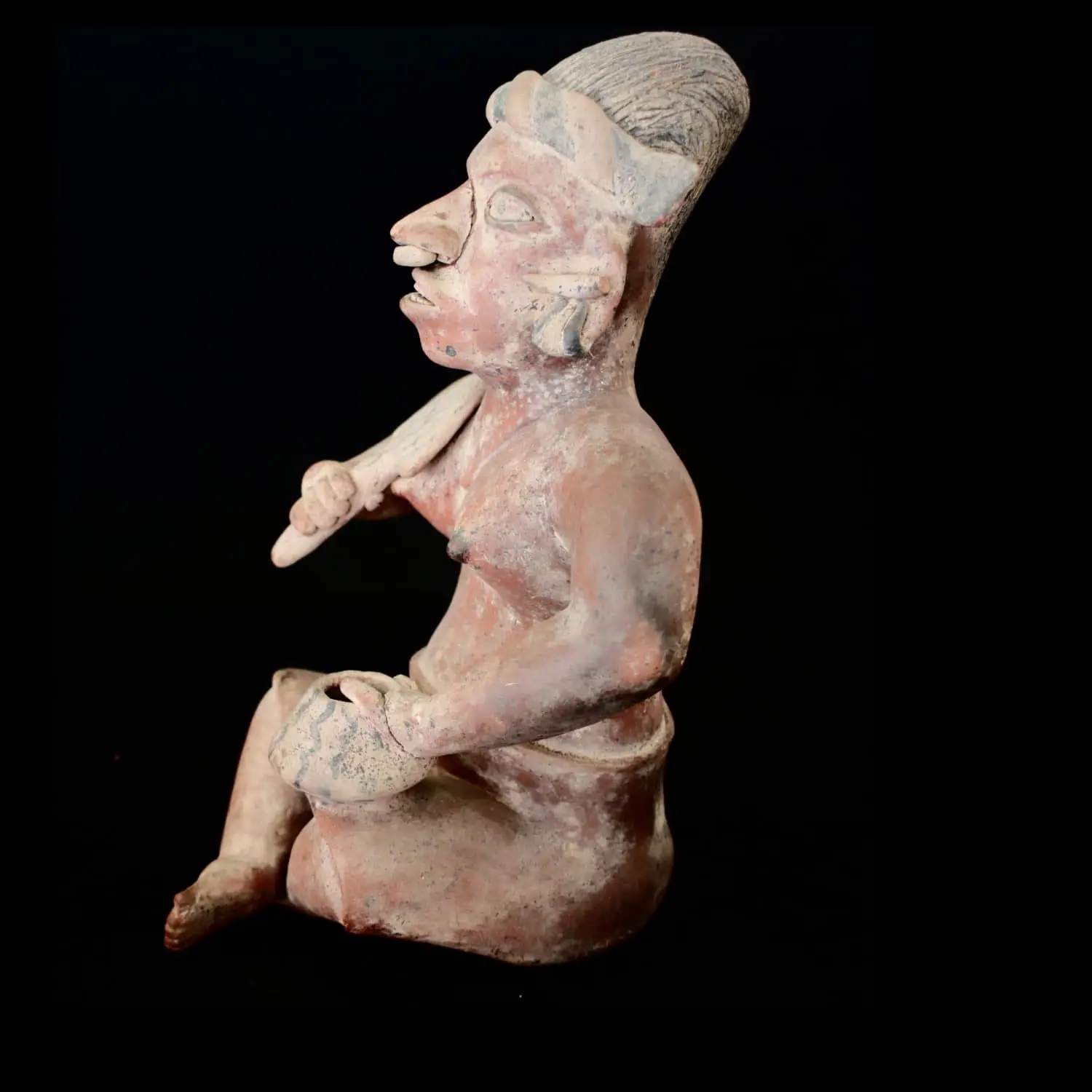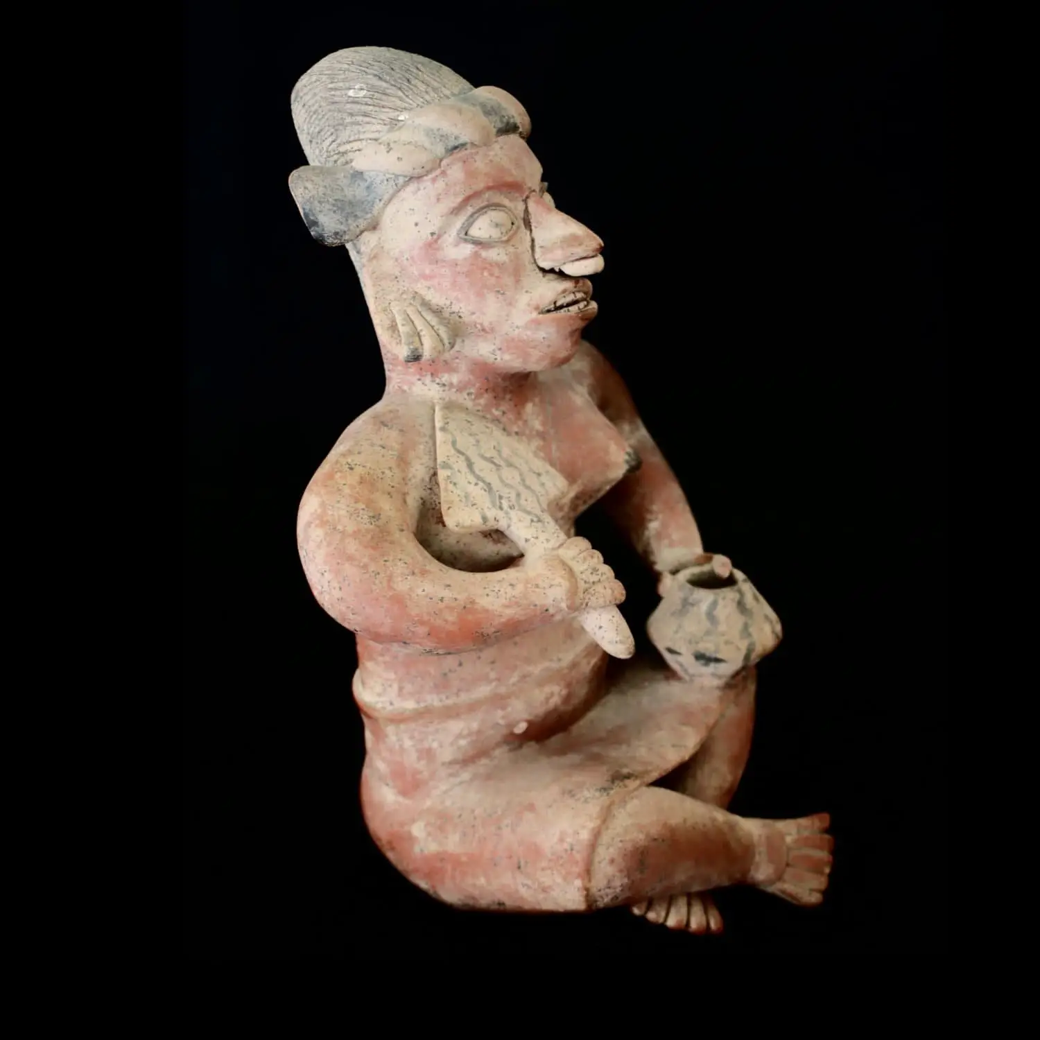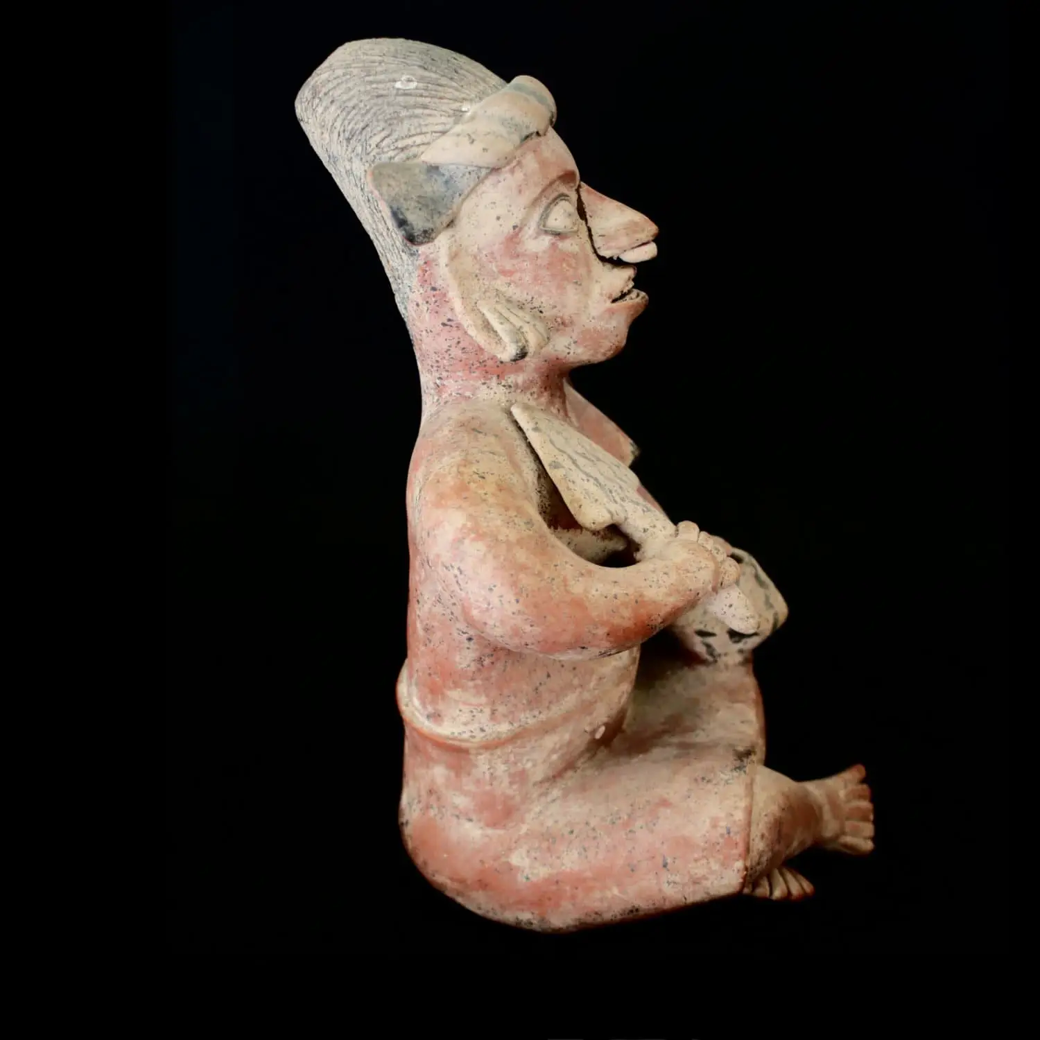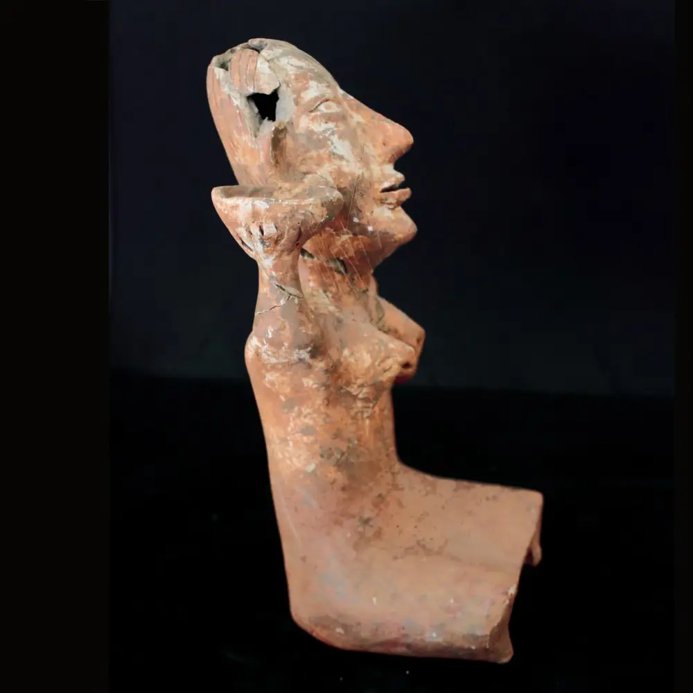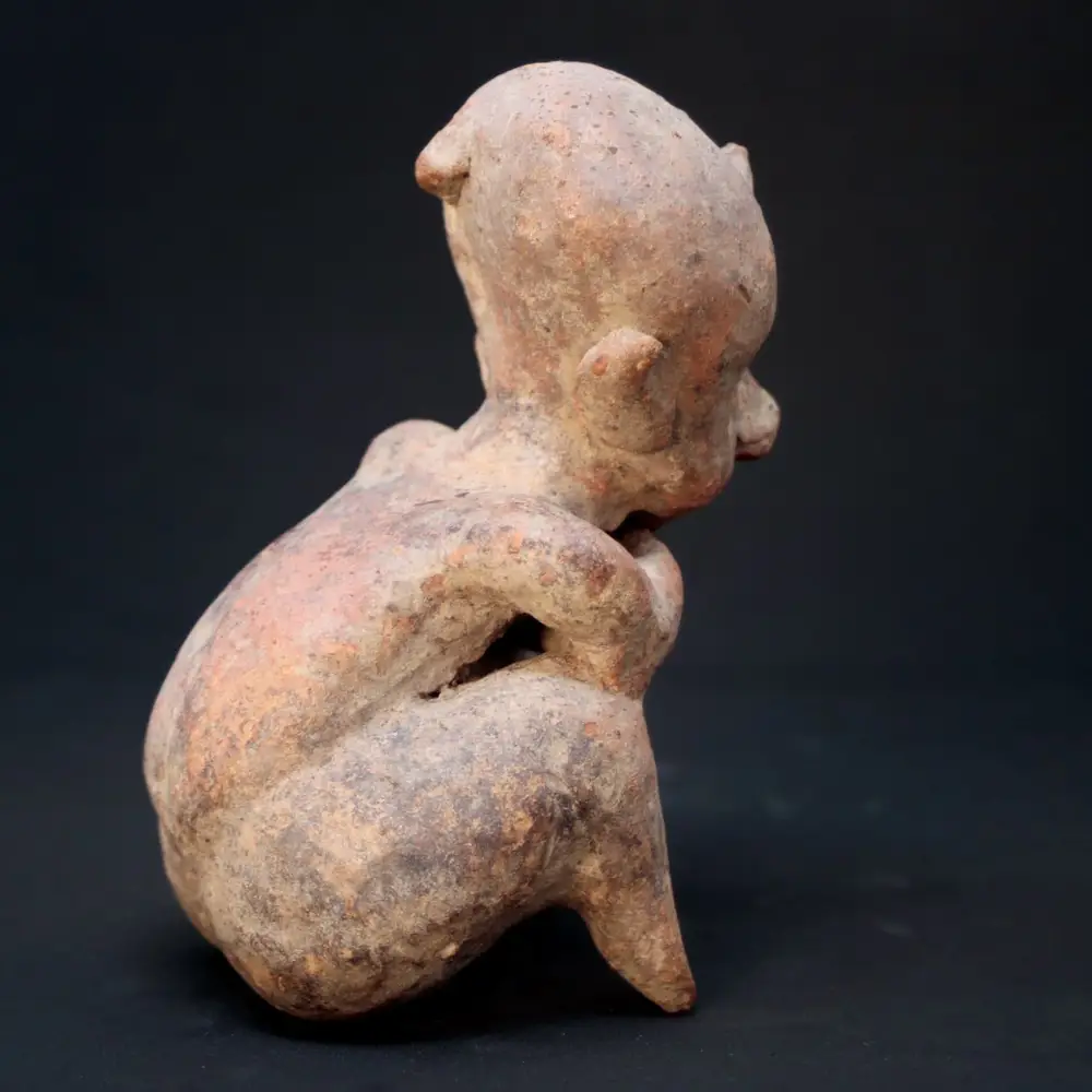 Figurilla hueca. Vista lateral. Encontrada en un contexto funerario. Figurilla femenina en forma sedente con la cabeza y los brazos recargados sobre la rodilla izquierda. Es muy notoria la deformación craneal y los adornos de concha que lleva sobre la nariz y la oreja (orejaras y narigueras). La figurilla está desnuda y solo porta cinturón y se aprecian restos de pintura facial y corporal.