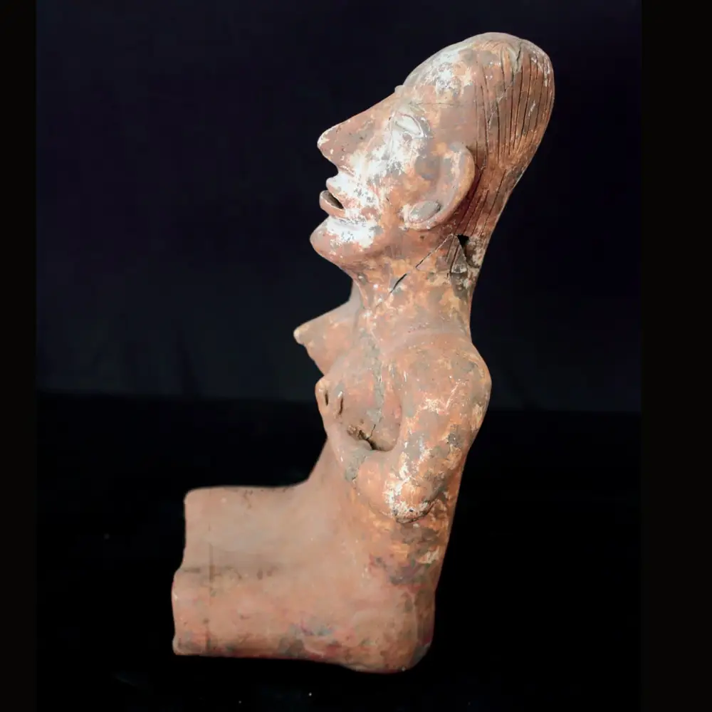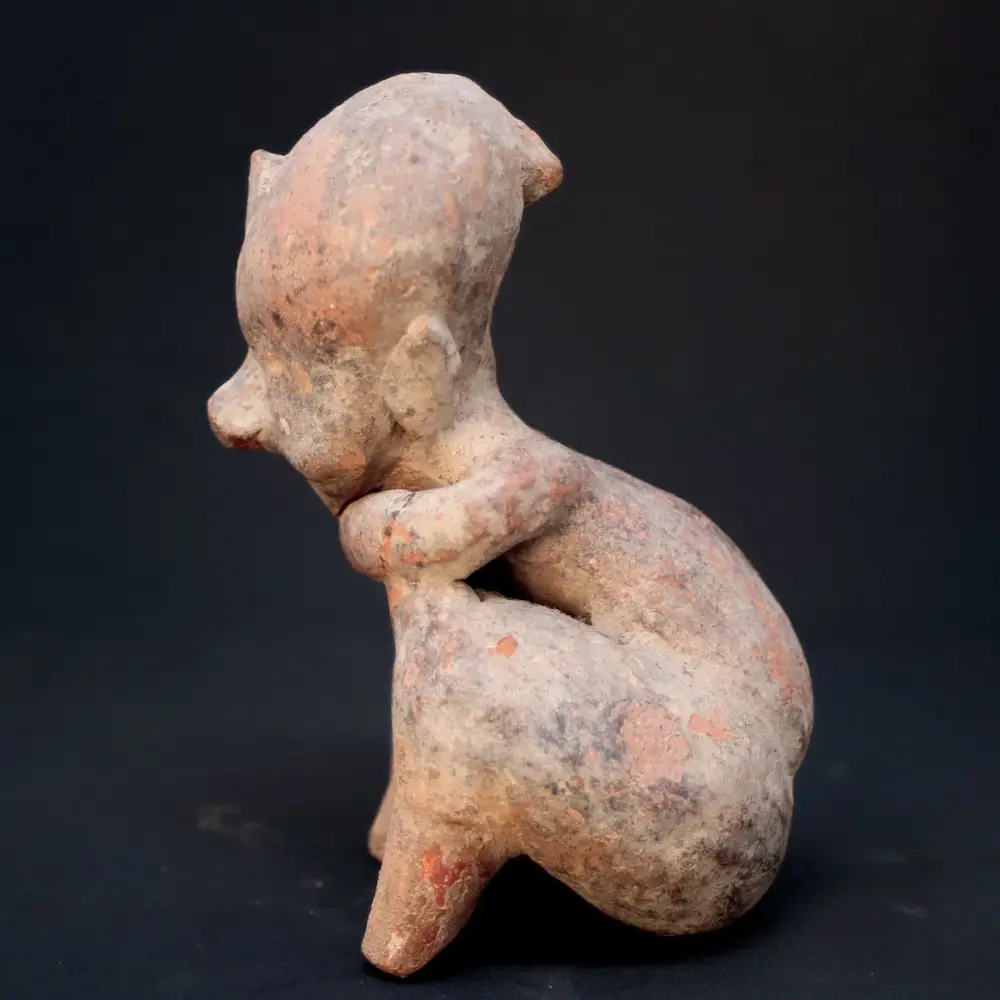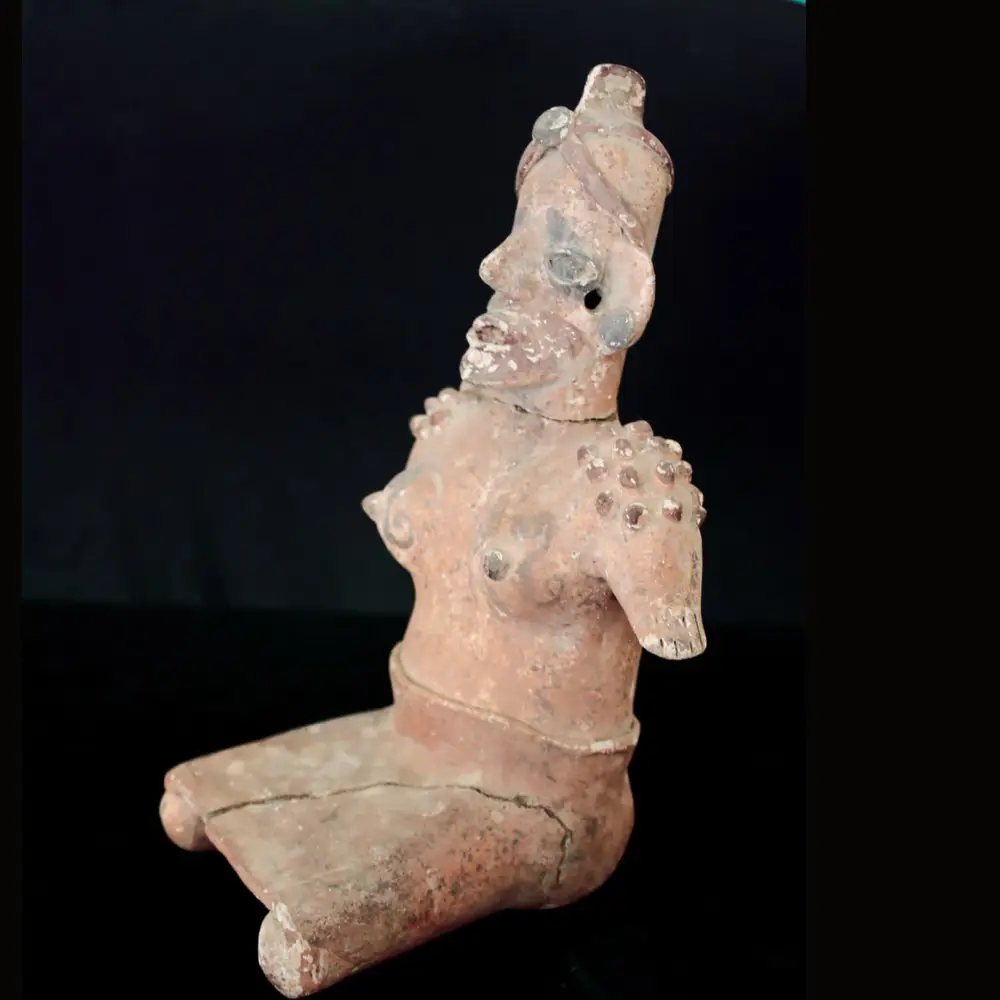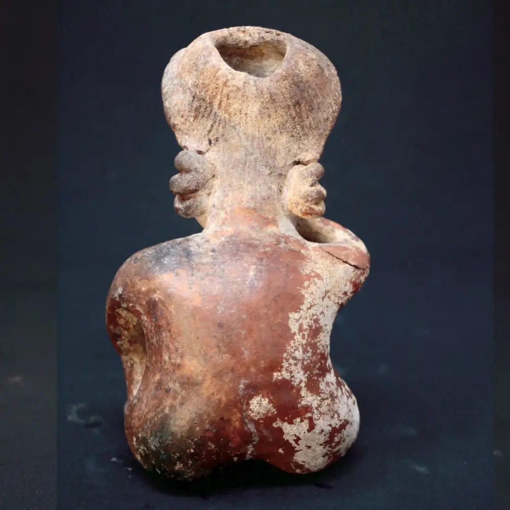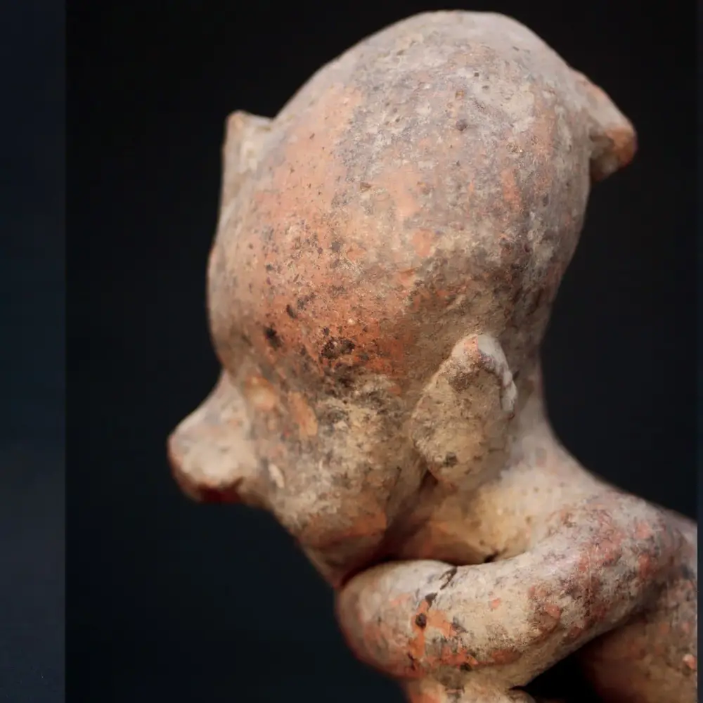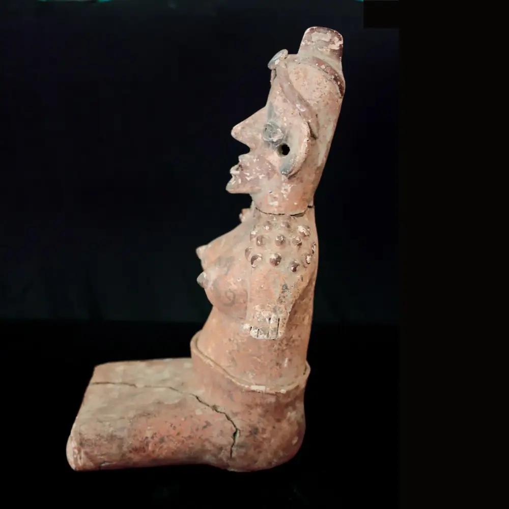 Figurilla hueca. Vista lateral. Encontrada en un contexto funerario. Figurilla femenina en forma sedente con la cabeza y los brazos recargados sobre la rodilla izquierda. Es muy notoria la deformación craneal y los adornos de concha que lleva sobre la nariz y la oreja (orejaras y narigueras). La figurilla está desnuda y solo porta cinturón y se aprecian restos de pintura facial y corporal.