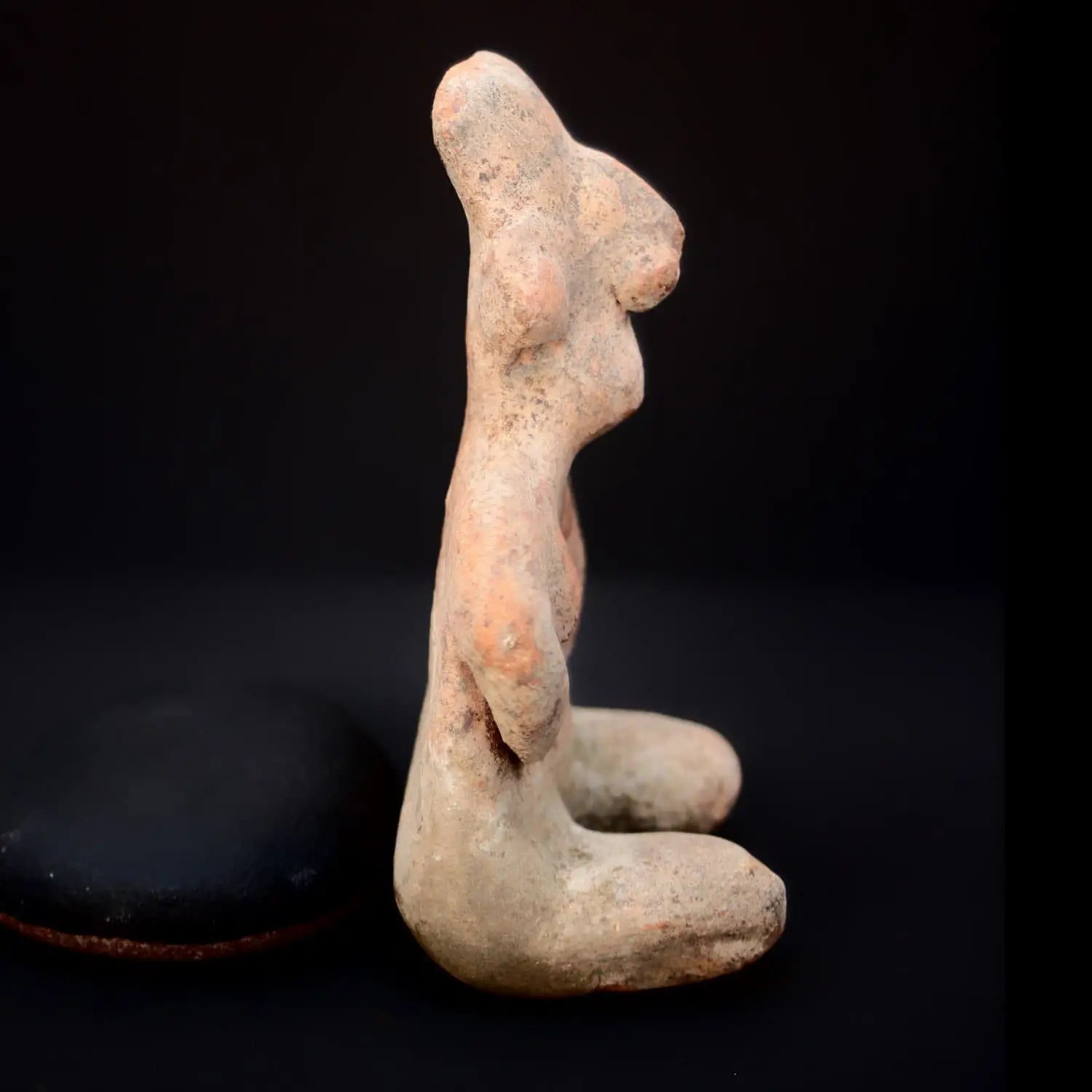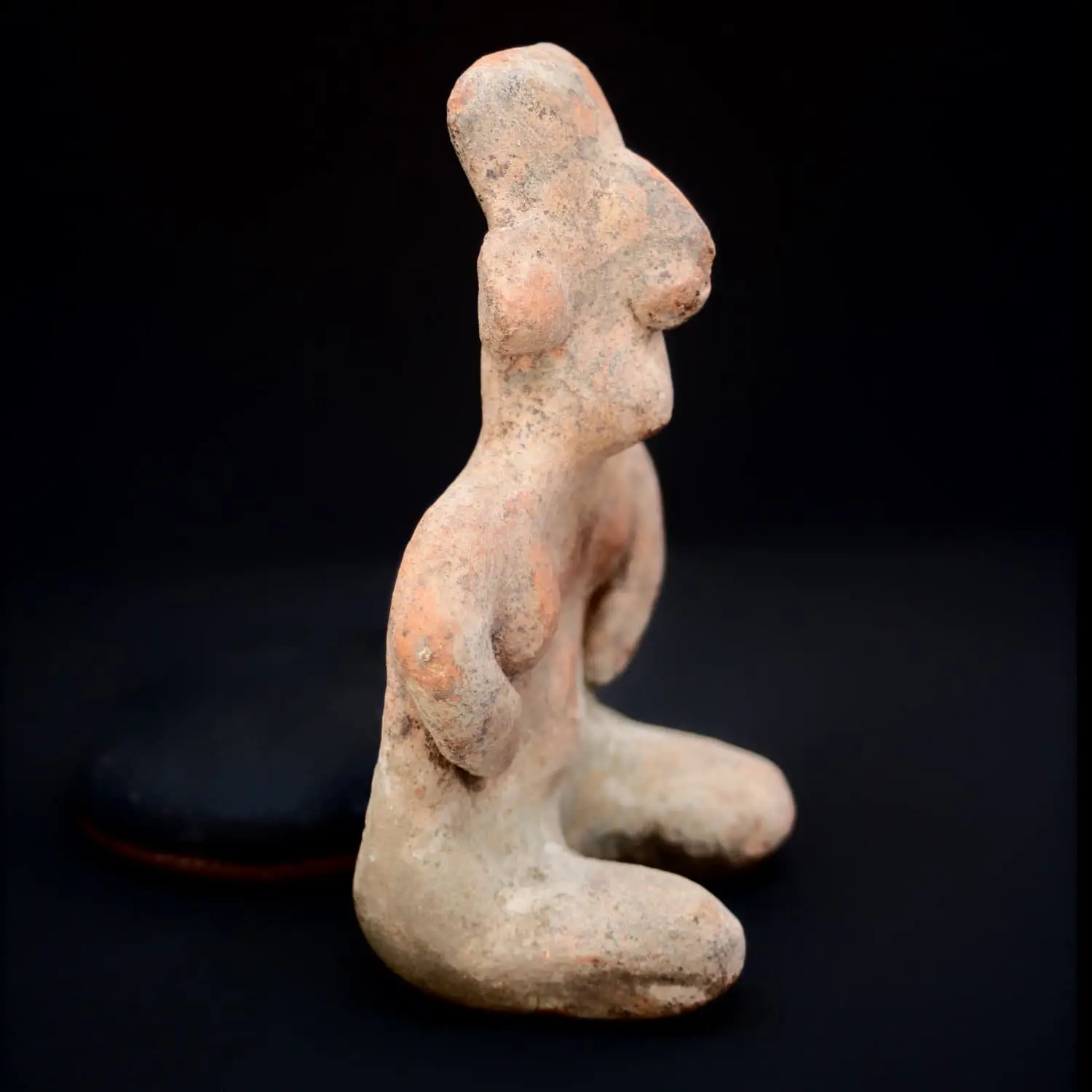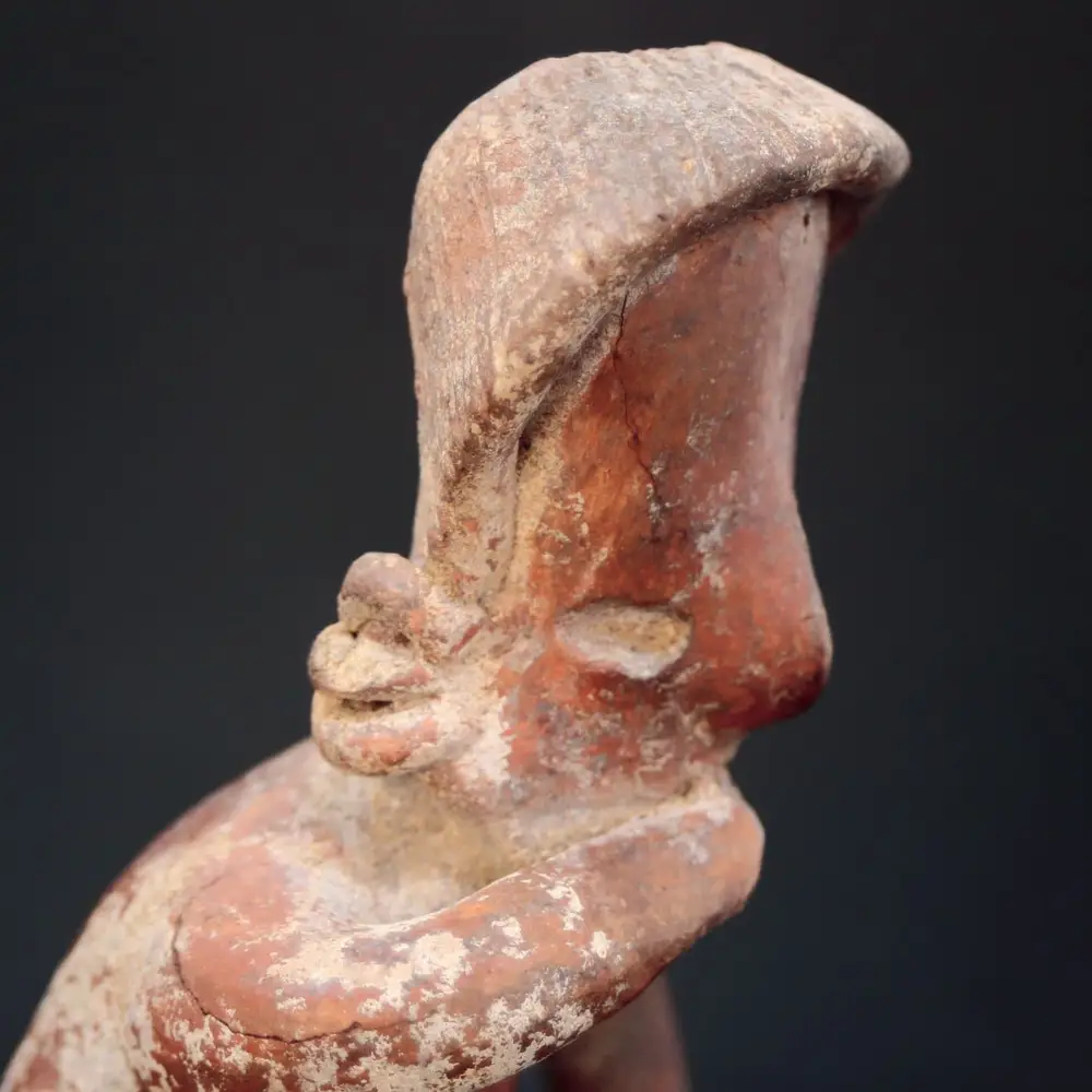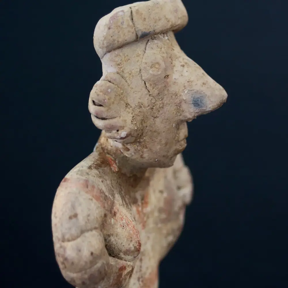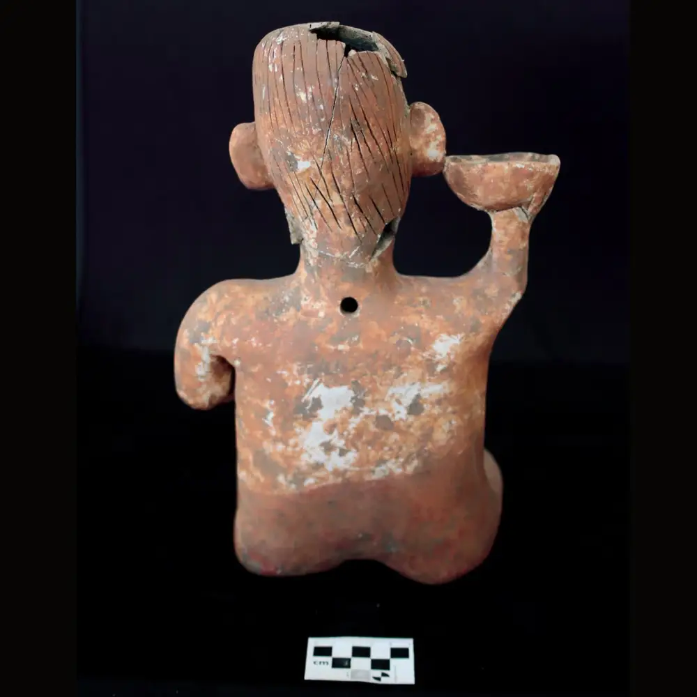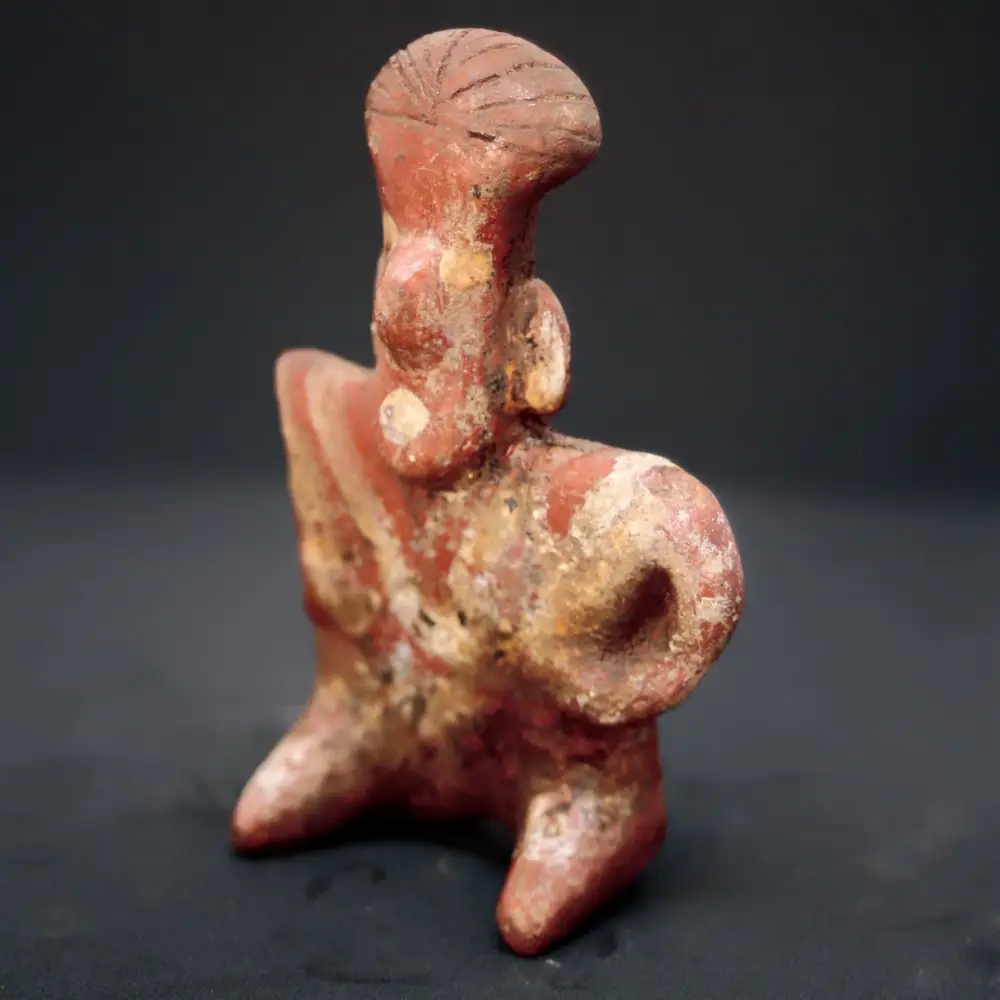 Figurilla hueca. Vista lateral. Encontrada en un contexto funerario. Figurilla femenina en forma sedente con la cabeza y los brazos recargados sobre la rodilla izquierda. Es muy notoria la deformación craneal y los adornos de concha que lleva sobre la nariz y la oreja (orejaras y narigueras). La figurilla está desnuda y solo porta cinturón y se aprecian restos de pintura facial y corporal.