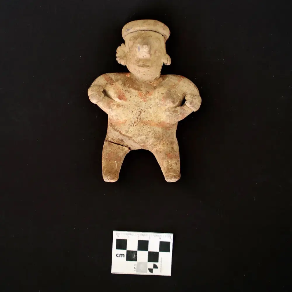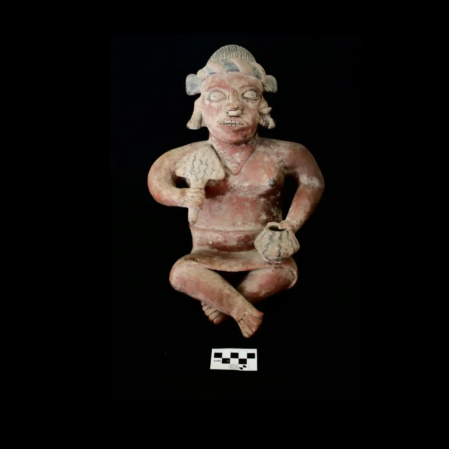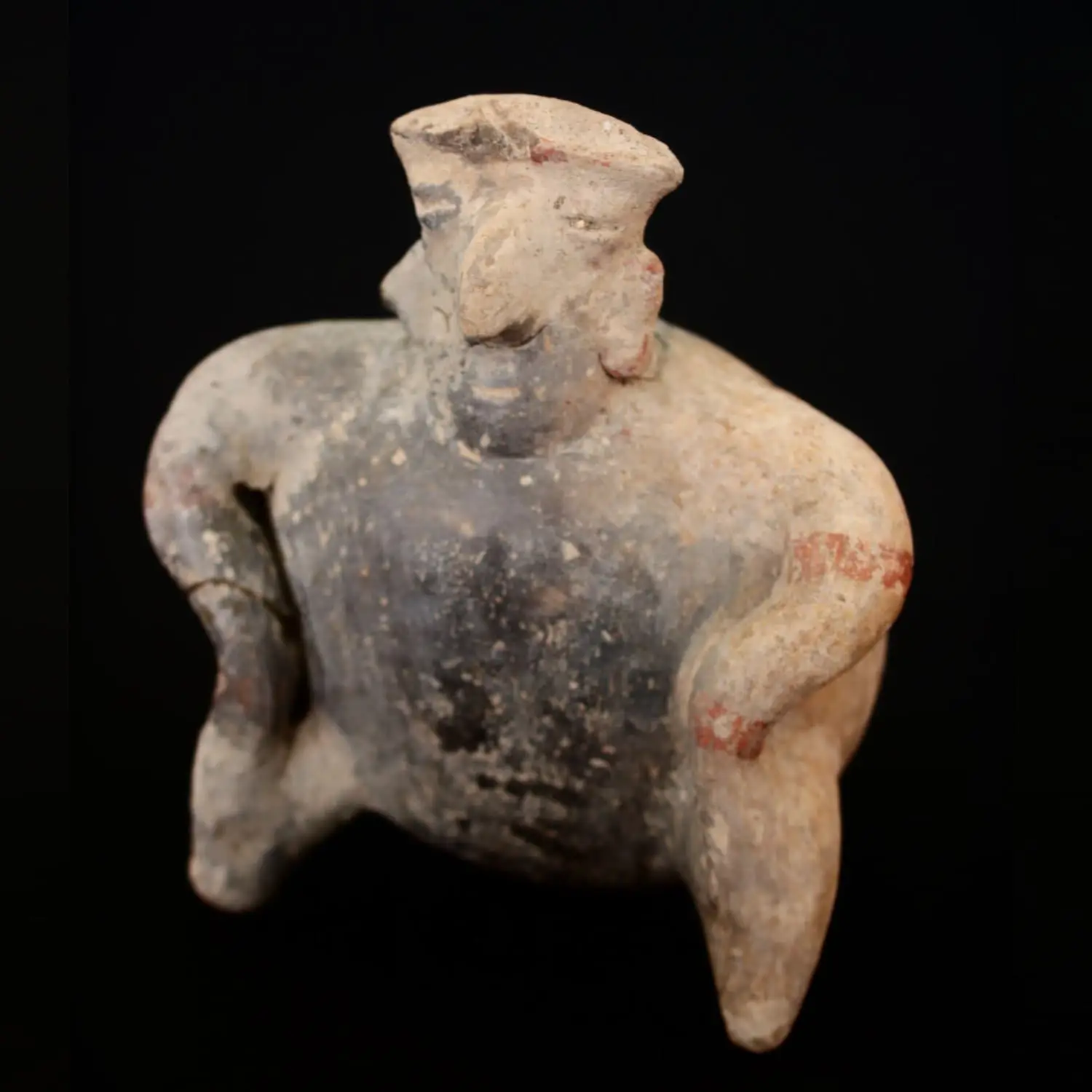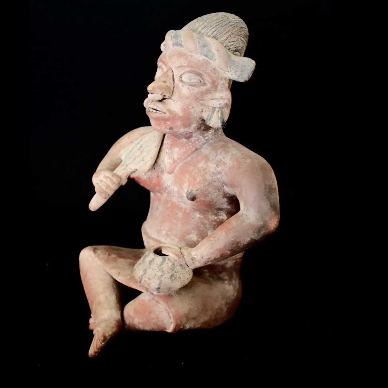 Figurilla antropomorfa tipo sonaja. Cerámica hecha con la técnica de barro modelado y punzonado. Medidas aproximadas de 13 x 8cm. Fue encontrada en las excavaciones arqueológicas del Montículo 1 en la Zona de Monumentos de Ixtapa (Mountjoy 2003: PV-1). Está asociada a la fase Ixtapa Temprano (600 – 300a.C.). Representa a una persona sentada con las piernas cruzadas sosteniendo un cuenco con las manos. La cabeza y el cuerpo están huecos. Contiene un pequeño percutor en el interior del cuerpo que le permite sonar como sonaja. Presenta dos perforaciones en los hombros para poder sostener a la figurilla suspendida de una cuerda o cordón. Esta figurilla sonaja es una de las más antiguas representaciones de la figura humana encontradas en la zona costera.