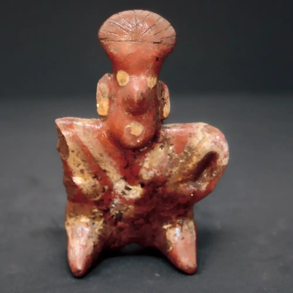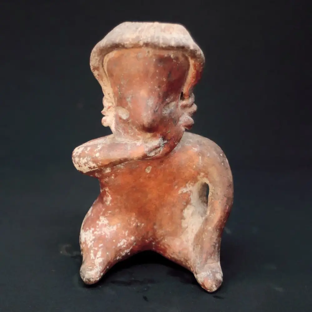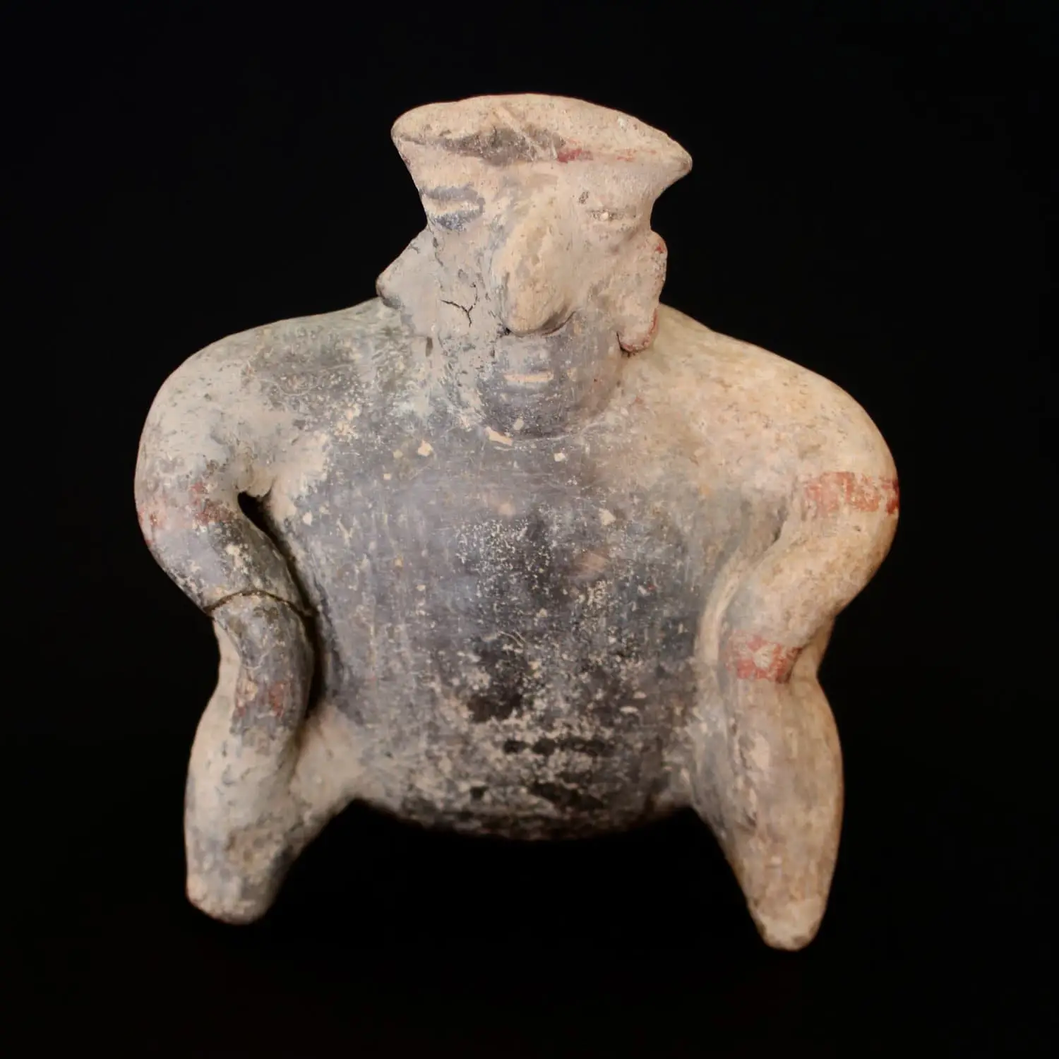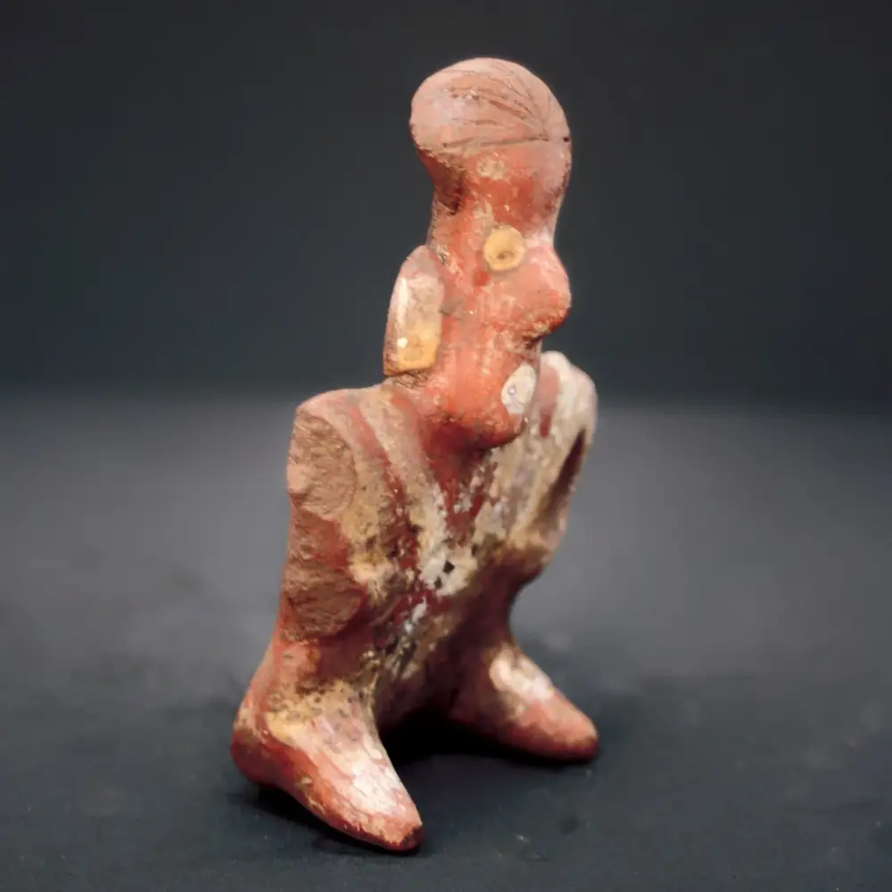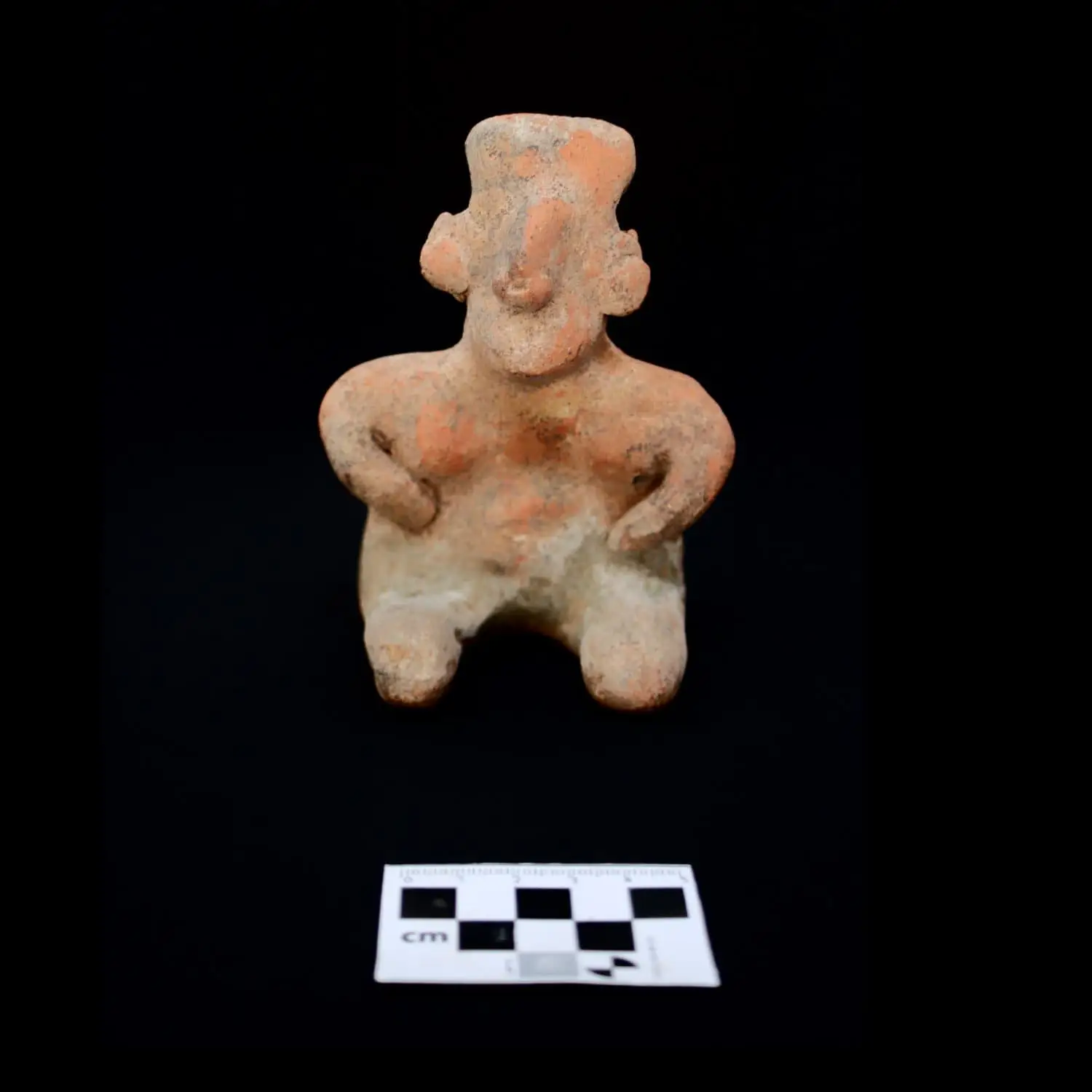 Figurilla antropomorfa tipo sonaja. Cerámica hecha con la técnica de barro modelado y punzonado. Medidas aproximadas de 13 x 8cm. Fue encontrada en las excavaciones arqueológicas del Montículo 1 en la Zona de Monumentos de Ixtapa (Mountjoy 2003: PV-1). Está asociada a la fase Ixtapa Temprano (600 – 300a.C.). Representa a una persona sentada con las piernas cruzadas sosteniendo un cuenco con las manos. La cabeza y el cuerpo están huecos. Contiene un pequeño percutor en el interior del cuerpo que le permite sonar como sonaja. Presenta dos perforaciones en los hombros para poder sostener a la figurilla suspendida de una cuerda o cordón. Esta figurilla sonaja es una de las más antiguas representaciones de la figura humana encontradas en la zona costera.