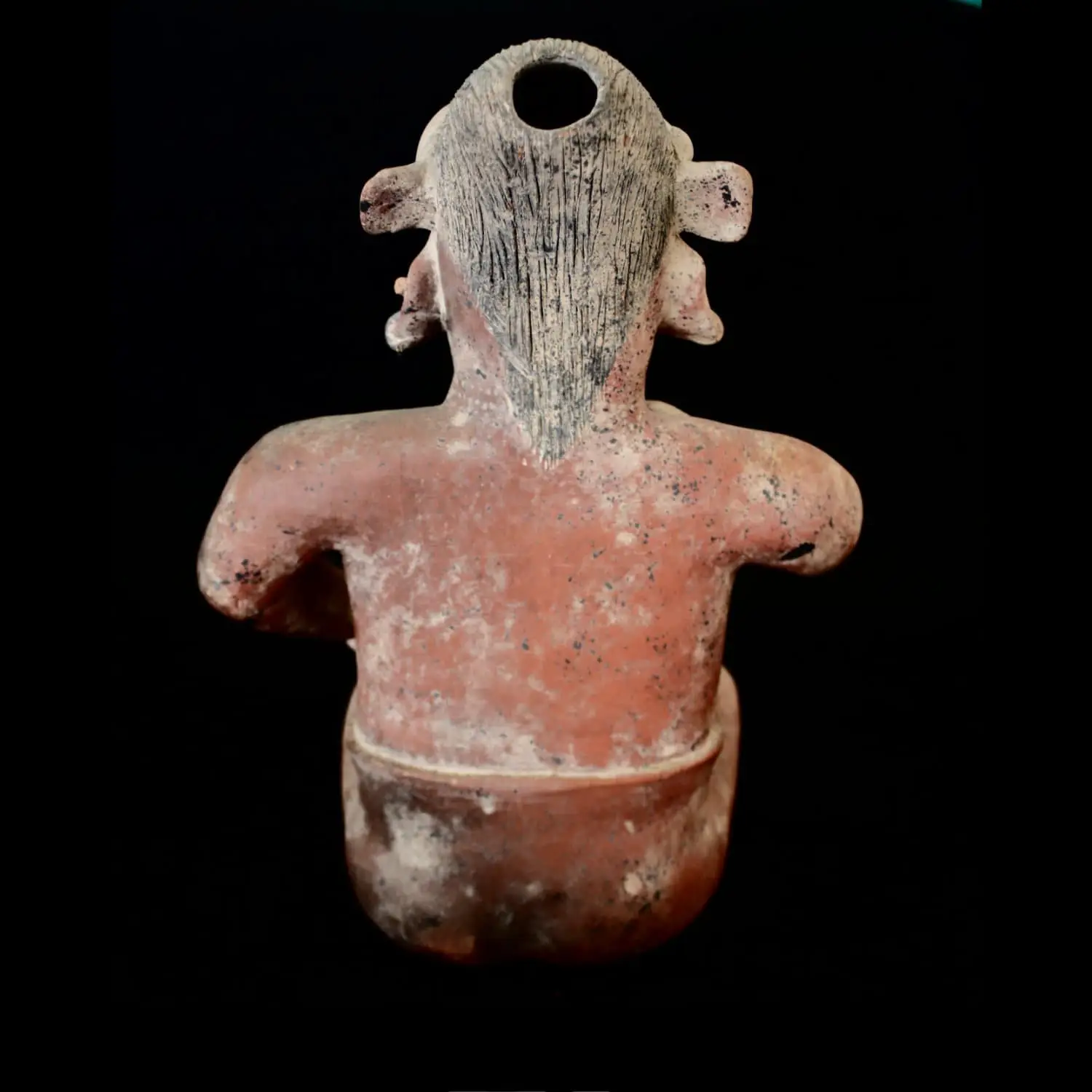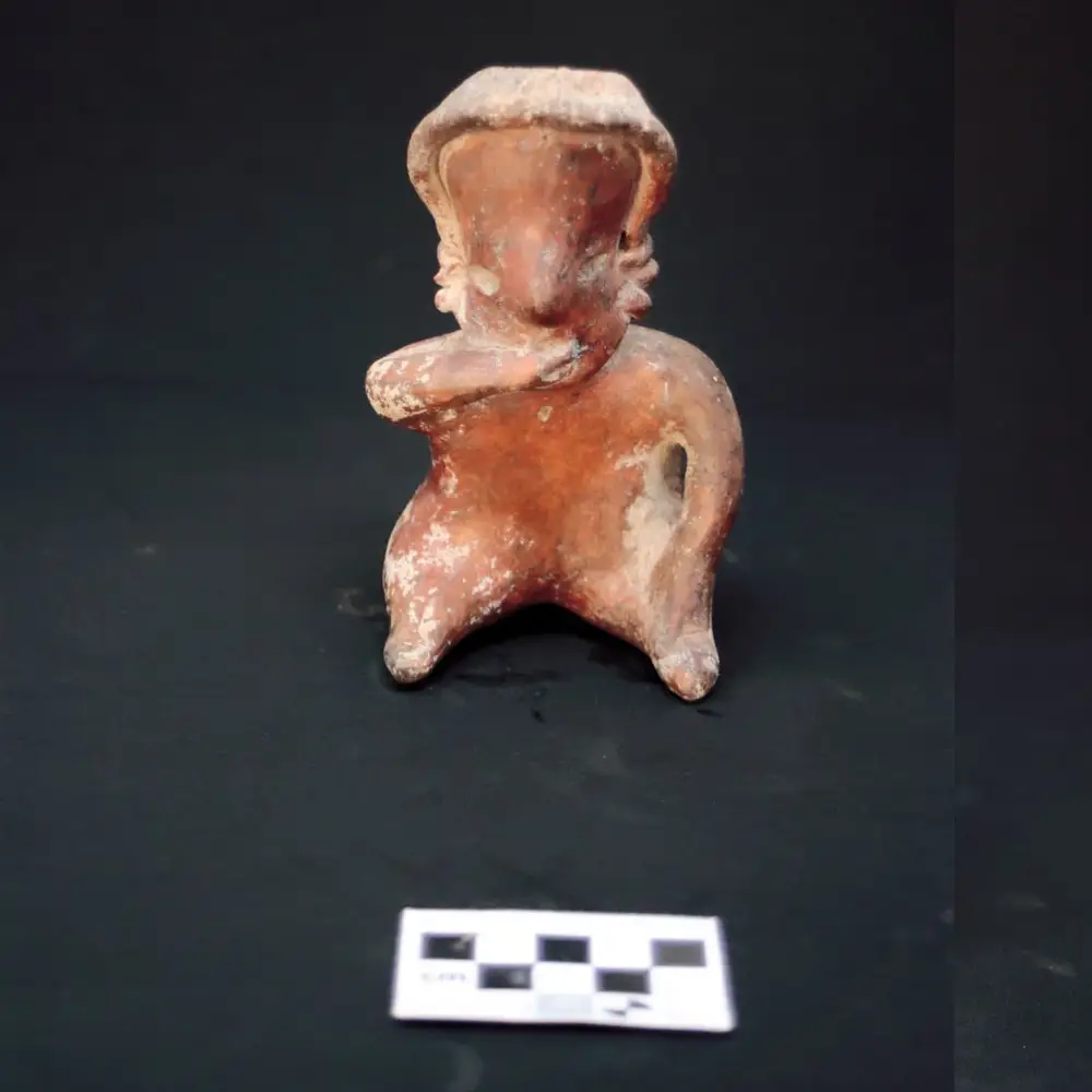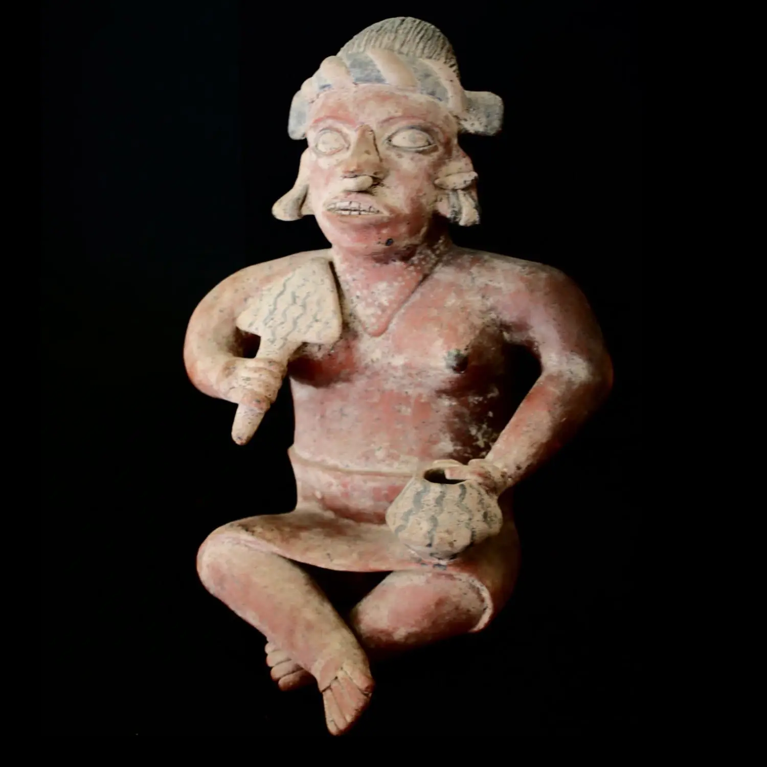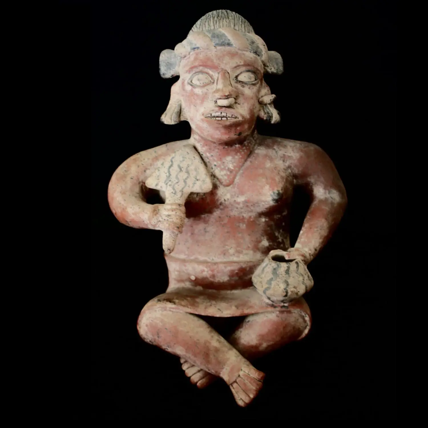 Figurilla antropomorfa tipo sonaja. Cerámica hecha con la técnica de barro modelado y punzonado. Medidas aproximadas de 13 x 8cm. Fue encontrada en las excavaciones arqueológicas del Montículo 1 en la Zona de Monumentos de Ixtapa (Mountjoy 2003: PV-1). Está asociada a la fase Ixtapa Temprano (600 – 300a.C.). Representa a una persona sentada con las piernas cruzadas sosteniendo un cuenco con las manos. La cabeza y el cuerpo están huecos. Contiene un pequeño percutor en el interior del cuerpo que le permite sonar como sonaja. Presenta dos perforaciones en los hombros para poder sostener a la figurilla suspendida de una cuerda o cordón. Esta figurilla sonaja es una de las más antiguas representaciones de la figura humana encontradas en la zona costera.