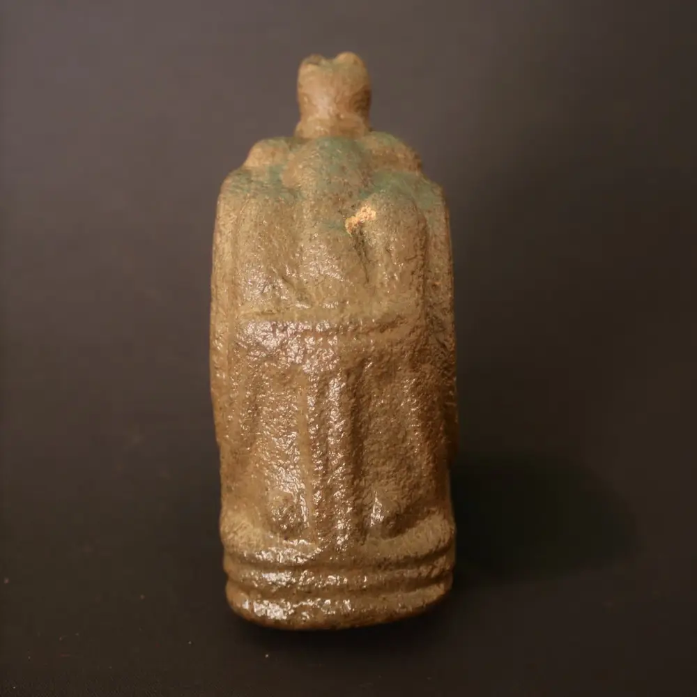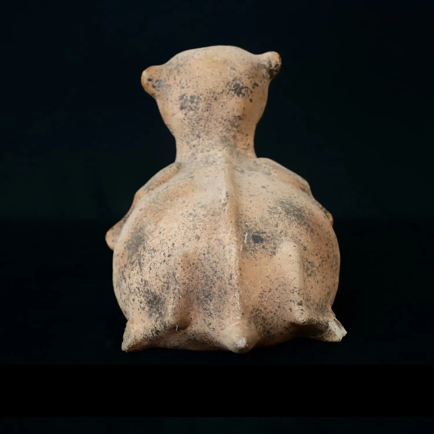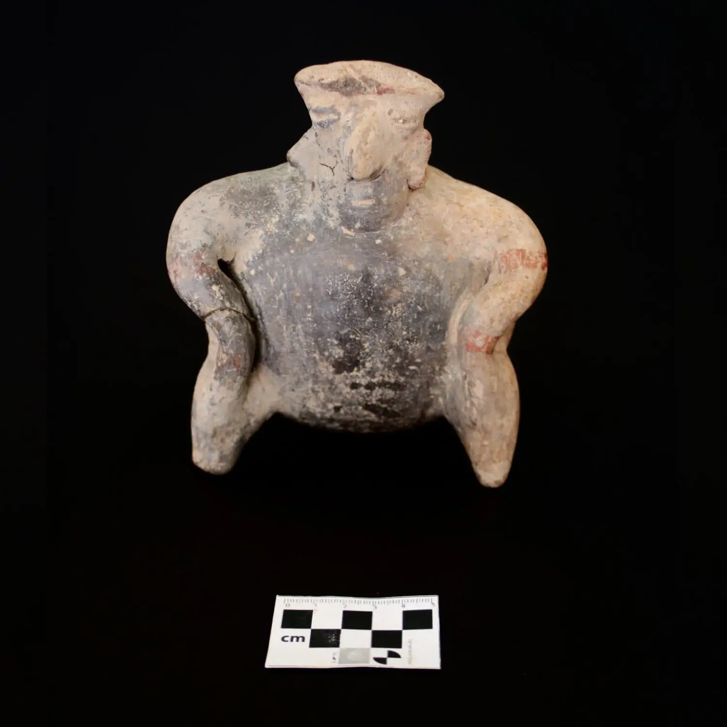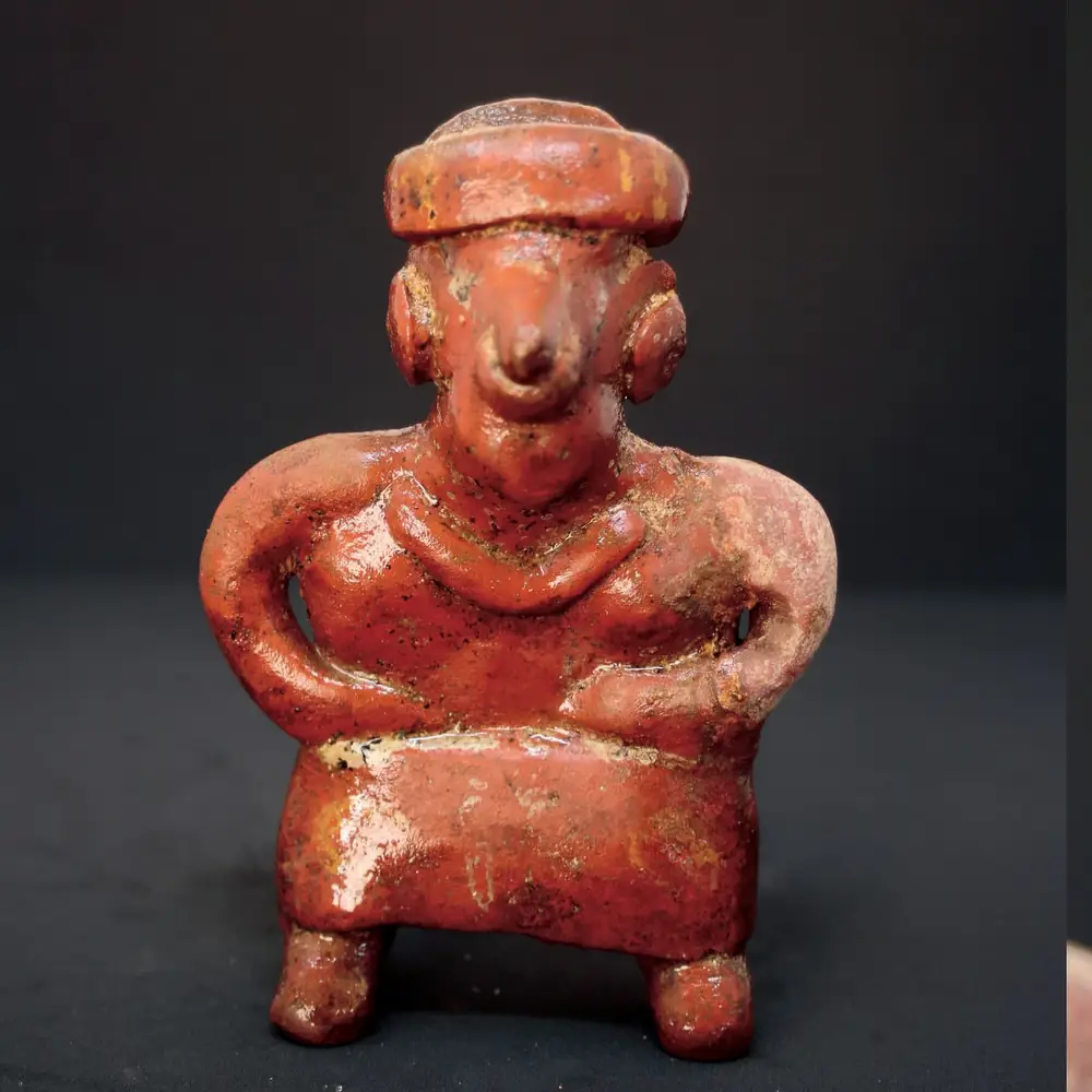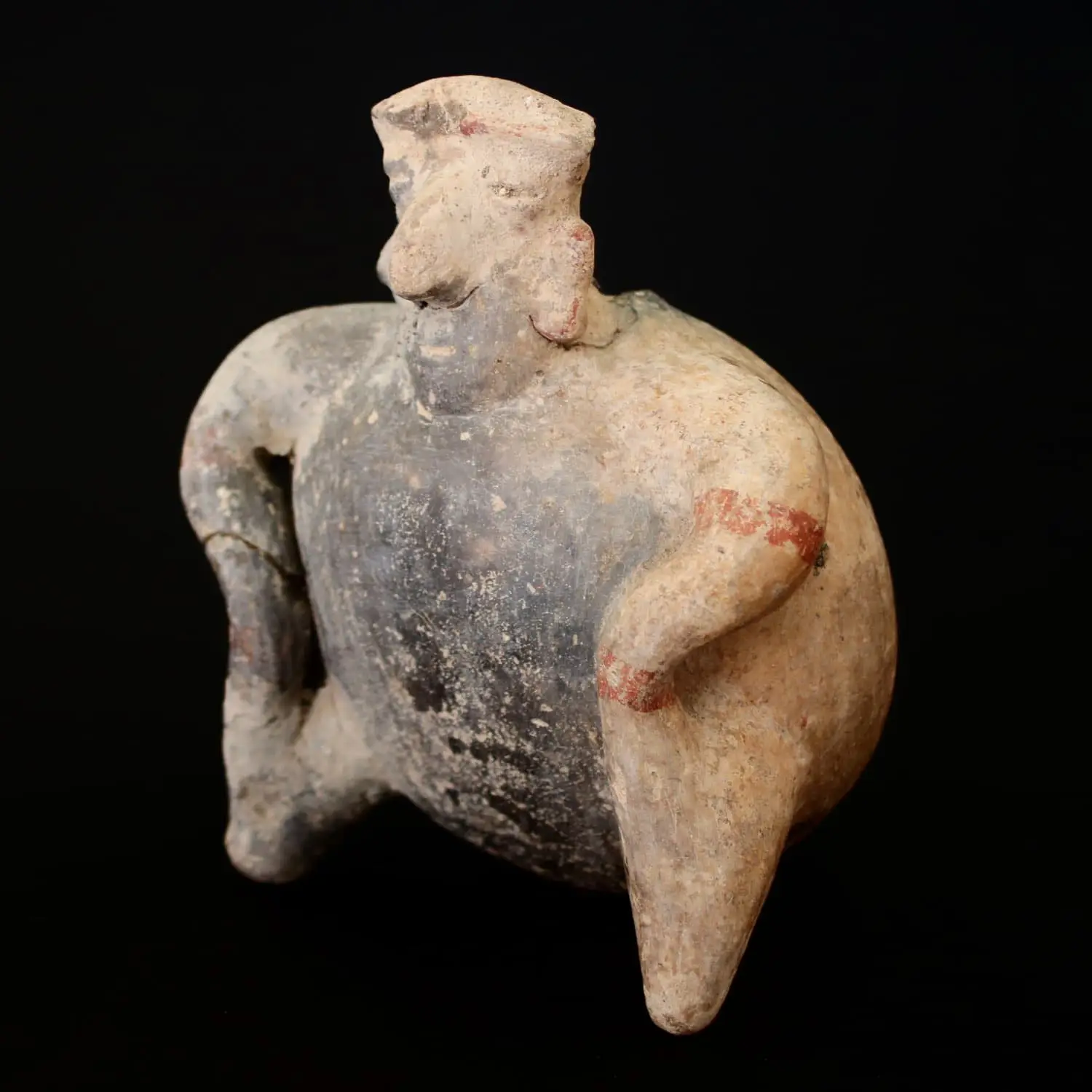Figurilla antropomorfa tipo sonaja. Cerámica hecha con la técnica de barro modelado y punzonado. Medidas aproximadas de 13 x 8cm. Fue encontrada en las excavaciones arqueológicas del Montículo 1 en la Zona de Monumentos de Ixtapa (Mountjoy 2003: PV-1). Está asociada a la fase Ixtapa Temprano (600 – 300a.C.). Representa a una persona sentada con las piernas cruzadas sosteniendo un cuenco con las manos. La cabeza y el cuerpo están huecos. Contiene un pequeño percutor en el interior del cuerpo que le permite sonar como sonaja. Presenta dos perforaciones en los hombros para poder sostener a la figurilla suspendida de una cuerda o cordón. Esta figurilla sonaja es una de las más antiguas representaciones de la figura humana encontradas en la zona costera.