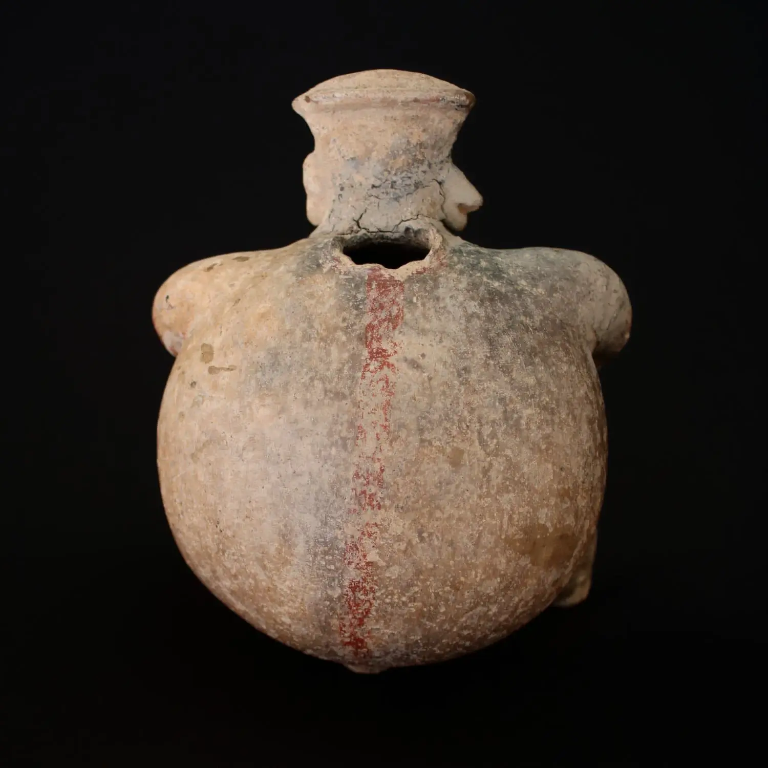 Olla efigie. Cerámica hecha con la técnica del barro enrollado, raspado, modelado, incisión y punzonado. Mide 15cm de altura, 12cm ancho, la cabeza mide 4cm de altura por 6.5cm de ancho. Proviene de la colección Escuela Teresa Barba (REG-1671 PJ221). Fechada para la fase Llanitos (600 – 900d.C.). La olla conserva pintura roja en el borde y tiene una decoración de diseños geométricos hechos con la técnica al negativo en la base.