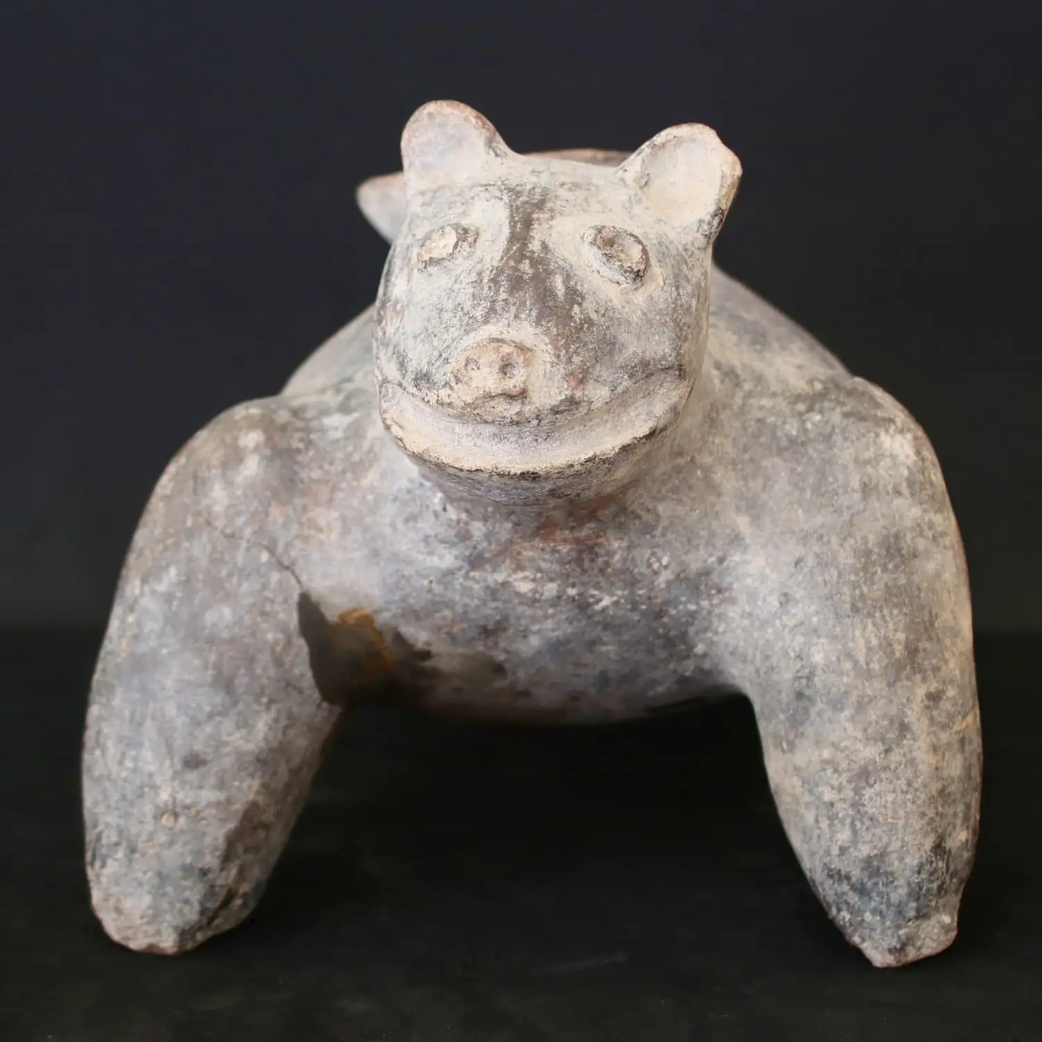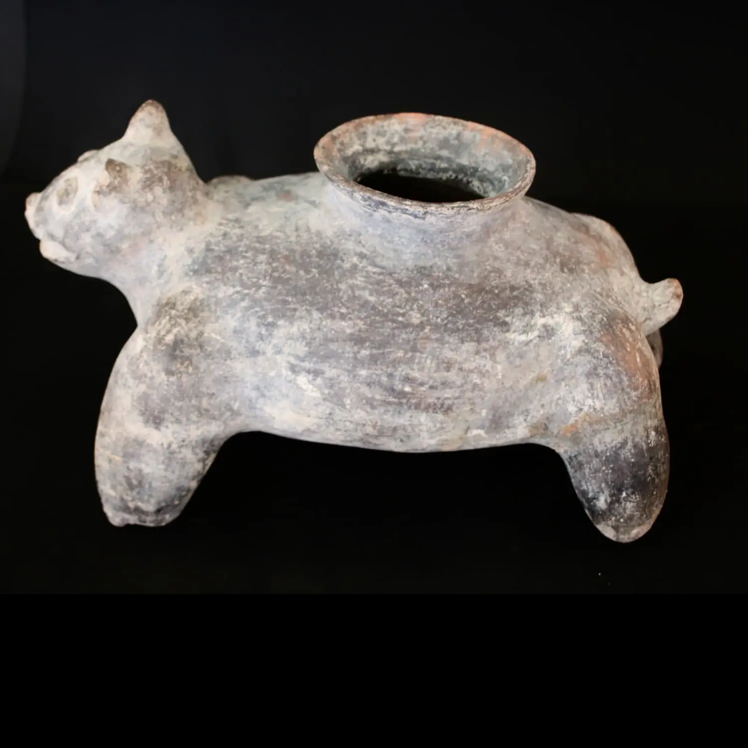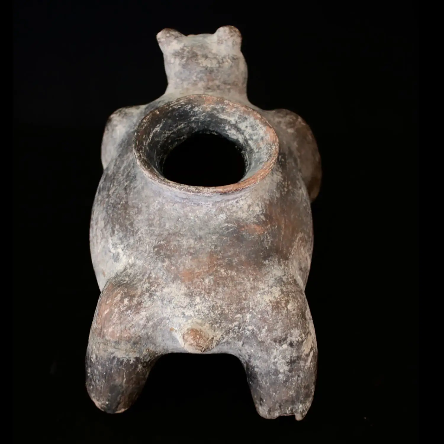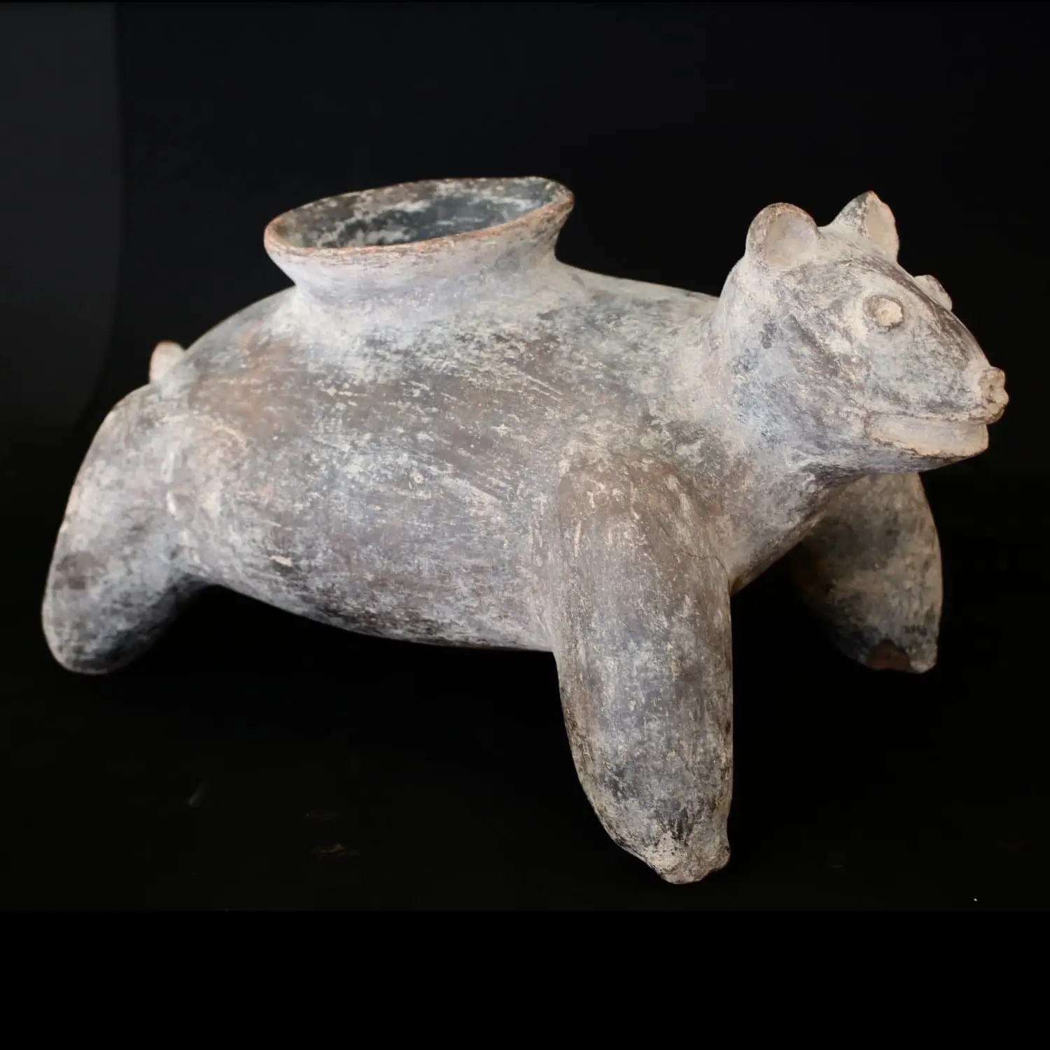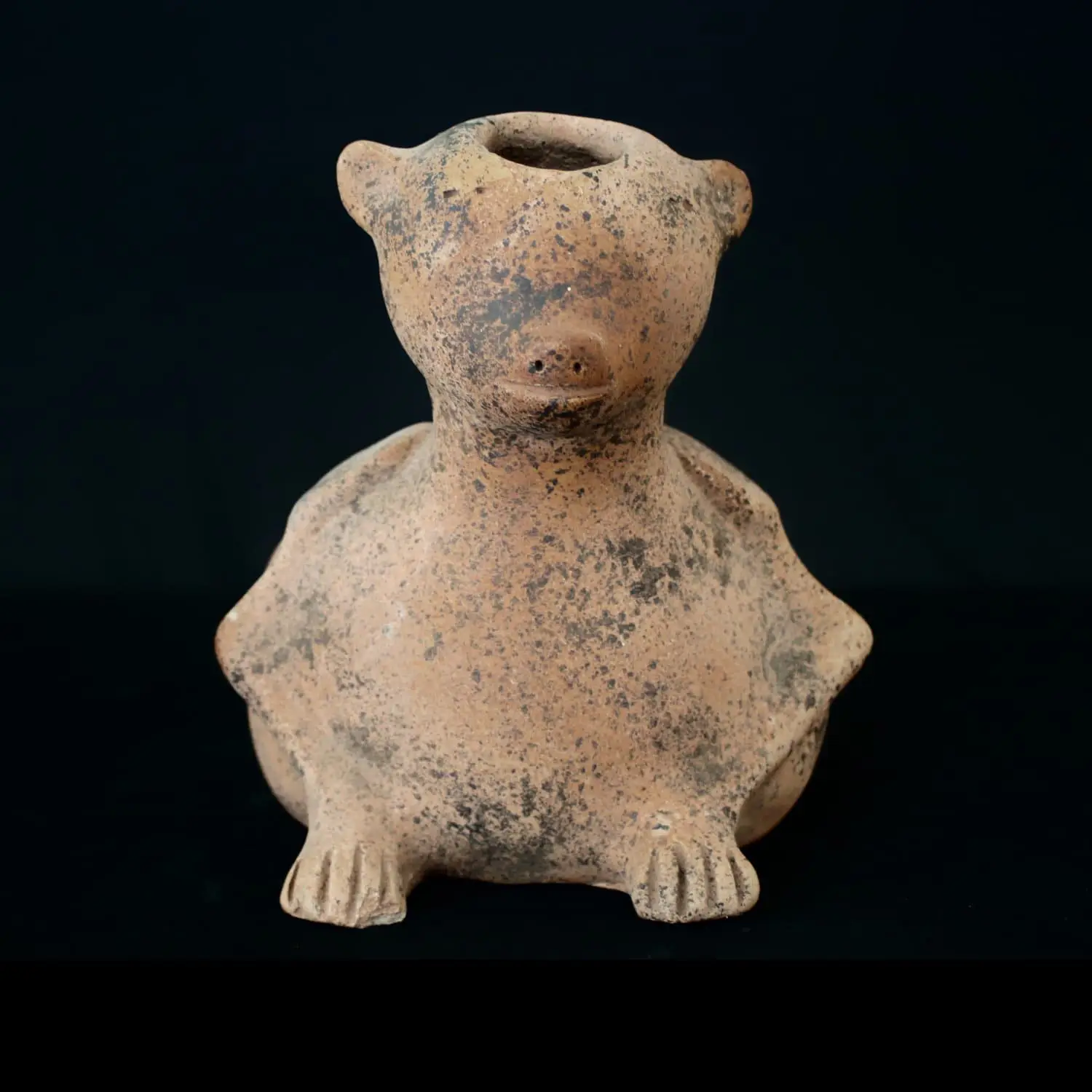 Vaso chocolatero zoomorfo. Piedra semipreciosa trabajada con la técnica de excavado, tallado, incisión y pulido, posiblemente alabastro. Mide 18 cm de altura por 10 cm de ancho. Forma parte de una colección particular y proviene de la Sierra Vallejo (Cerro Xiuhtepetl). Asociado a las fases Aztatlán - Banderas (900 – 1600 d.C.). Vaso trípode que presenta una cabeza zoomorfa en relieve, además tiene marcados en bajo relieve los brazos los cuales están flexionados con los antebrazos colocados sobre el estómago. La figura se puede interpretar como un tlacuache.