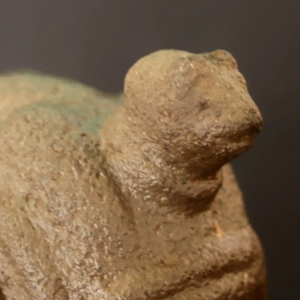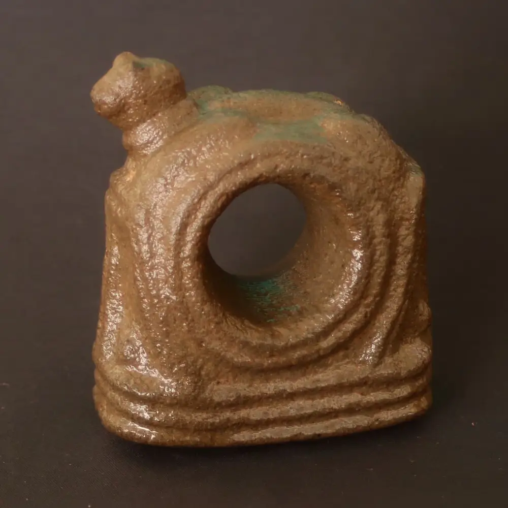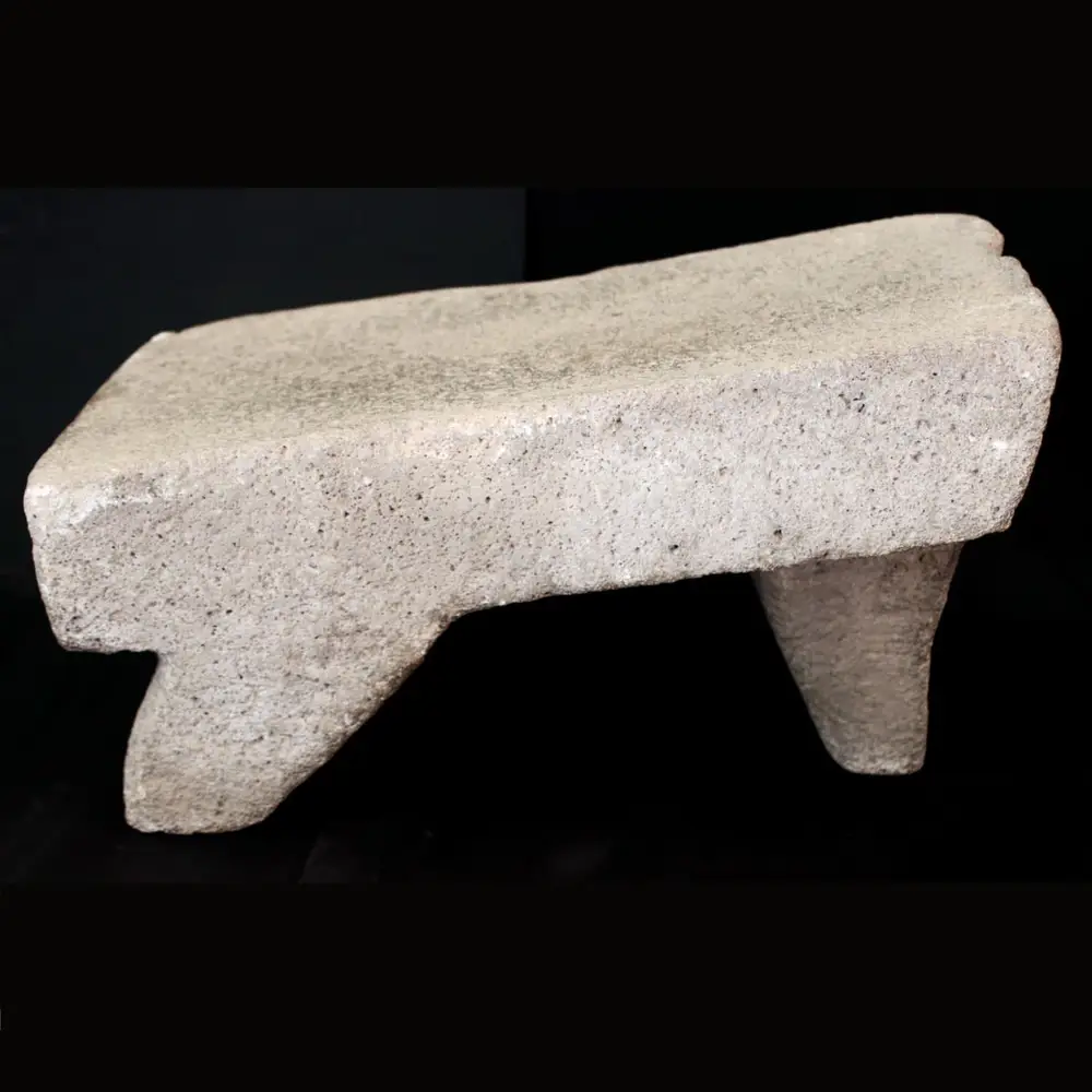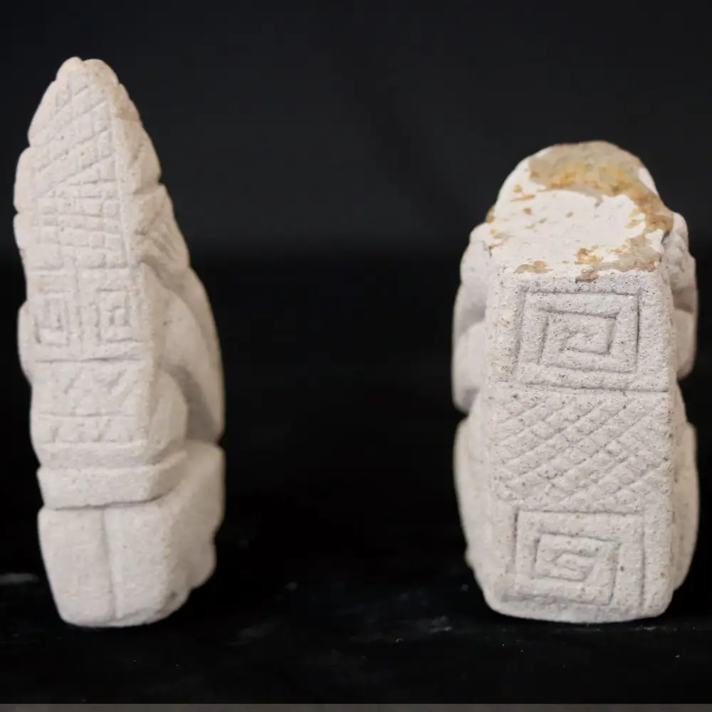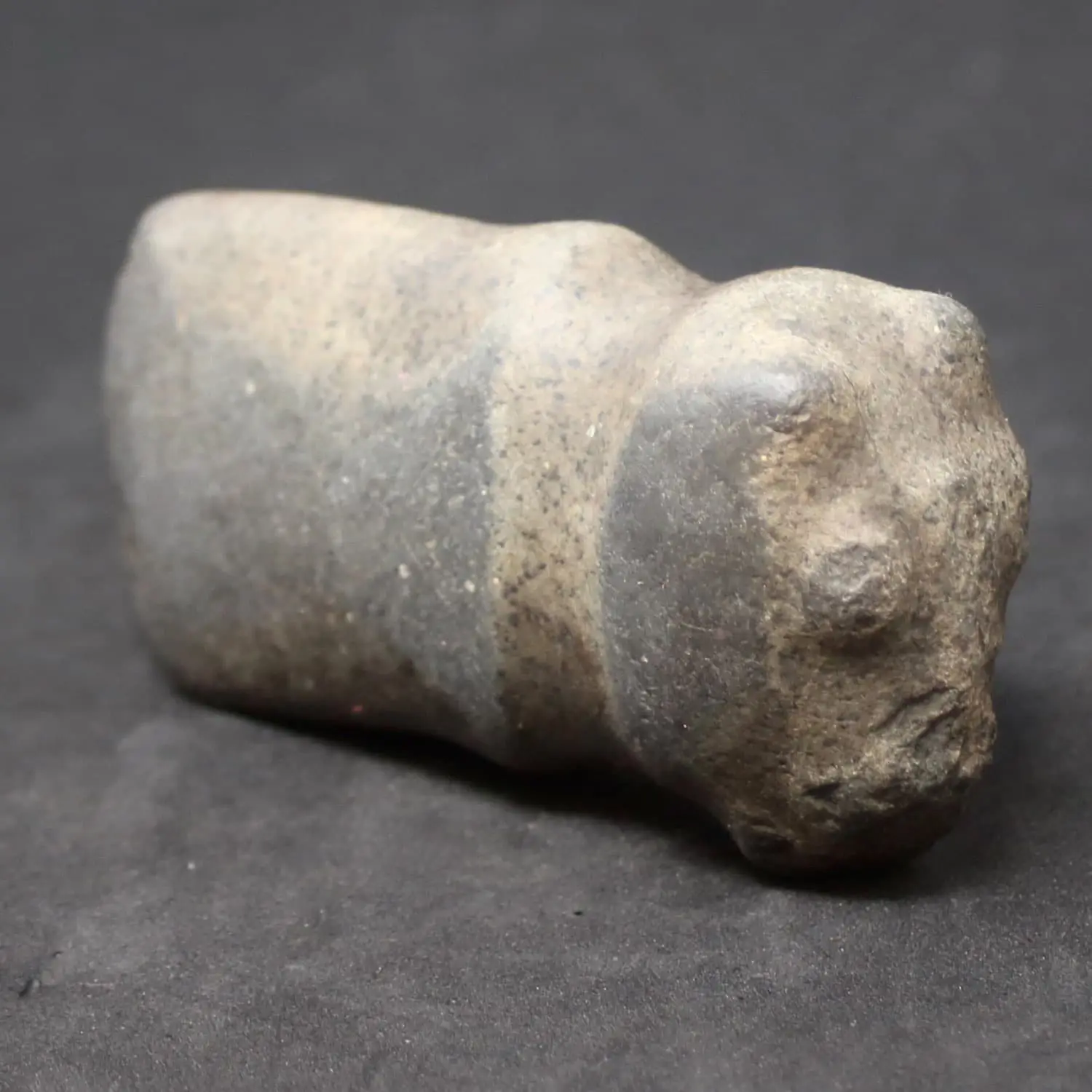 Vaso chocolatero zoomorfo. Piedra semipreciosa trabajada con la técnica de excavado, tallado, incisión y pulido, posiblemente alabastro. Mide 18 cm de altura por 10 cm de ancho. Forma parte de una colección particular y proviene de la Sierra Vallejo (Cerro Xiuhtepetl). Asociado a las fases Aztatlán - Banderas (900 – 1600 d.C.). Vaso trípode que presenta una cabeza zoomorfa en relieve, además tiene marcados en bajo relieve los brazos los cuales están flexionados con los antebrazos colocados sobre el estómago. La figura se puede interpretar como un tlacuache.