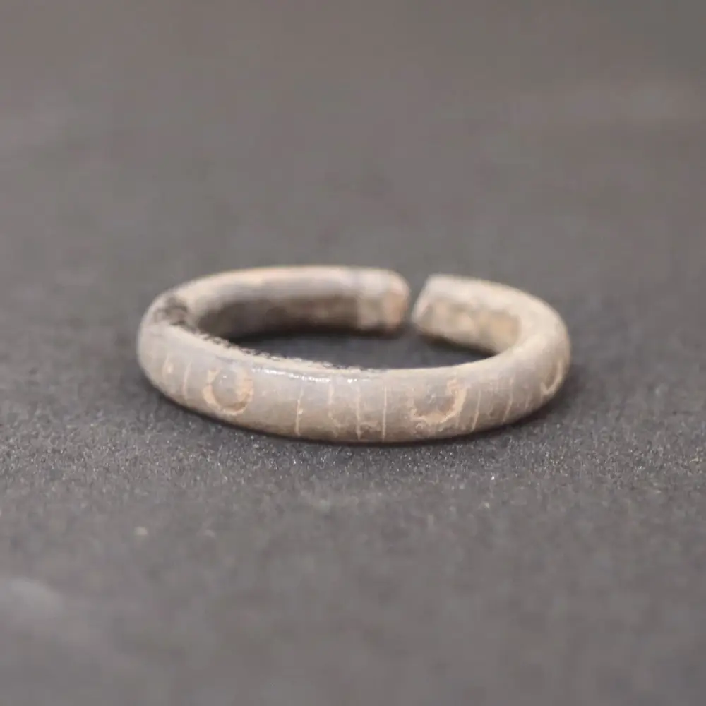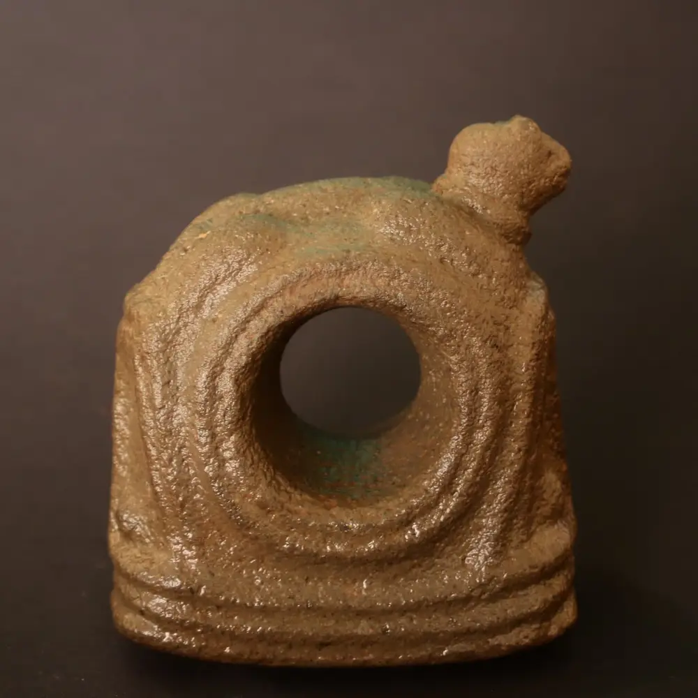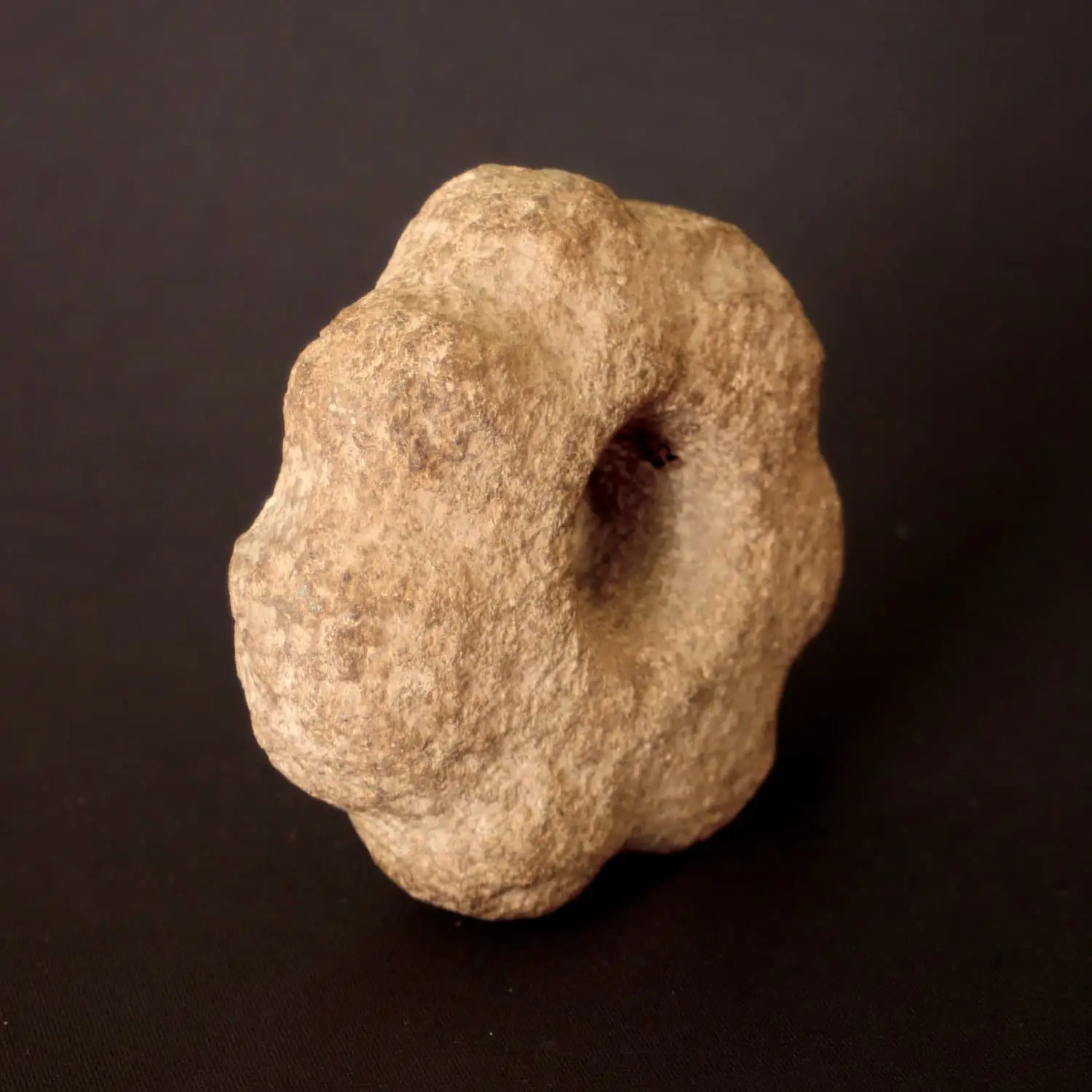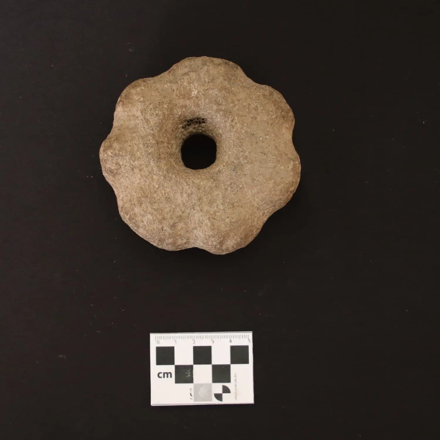 Sello de espiral. Vistas lateral e inferior. Cerámica hecha con la técnica de modelado. Mide 4.4cm de altura y 4.4cm de diámetro. Pertenece a la colección Escuela Teresa Barba (REG1671 PJ 392). Asociado a la fase Aztatlán (900 – 1200d.C.). En la vista lateral se observa que en el mango presenta un orificio para poder colgarse y la vista inferior muestra el estampado del sello en forma de espiral.