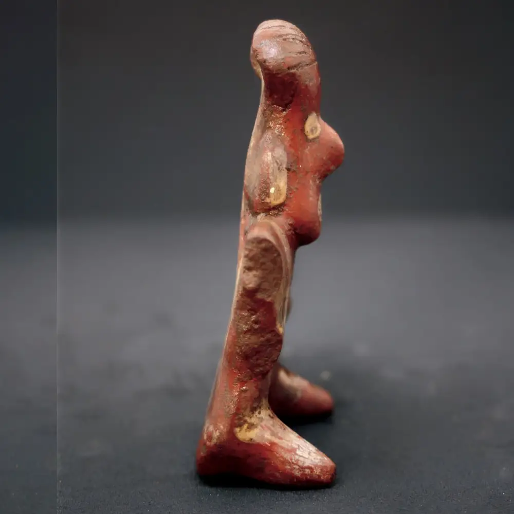 Figurilla hueca. Cerámica hecha con la técnica de modelado y punzonado. Proviene de la colección Escuela Teresa Barba (REG1671 PJ 323). Mide 10cm de altura por 4cm de ancho. Asociada a la fase Llanitos (600 – 900d.C.). Personaje de pie, con las manos sobre el vientre, lleva tocado y orejeras, presenta un par de orificios sobre el tocado posiblemente para colgarse o para introducir algún adorno.