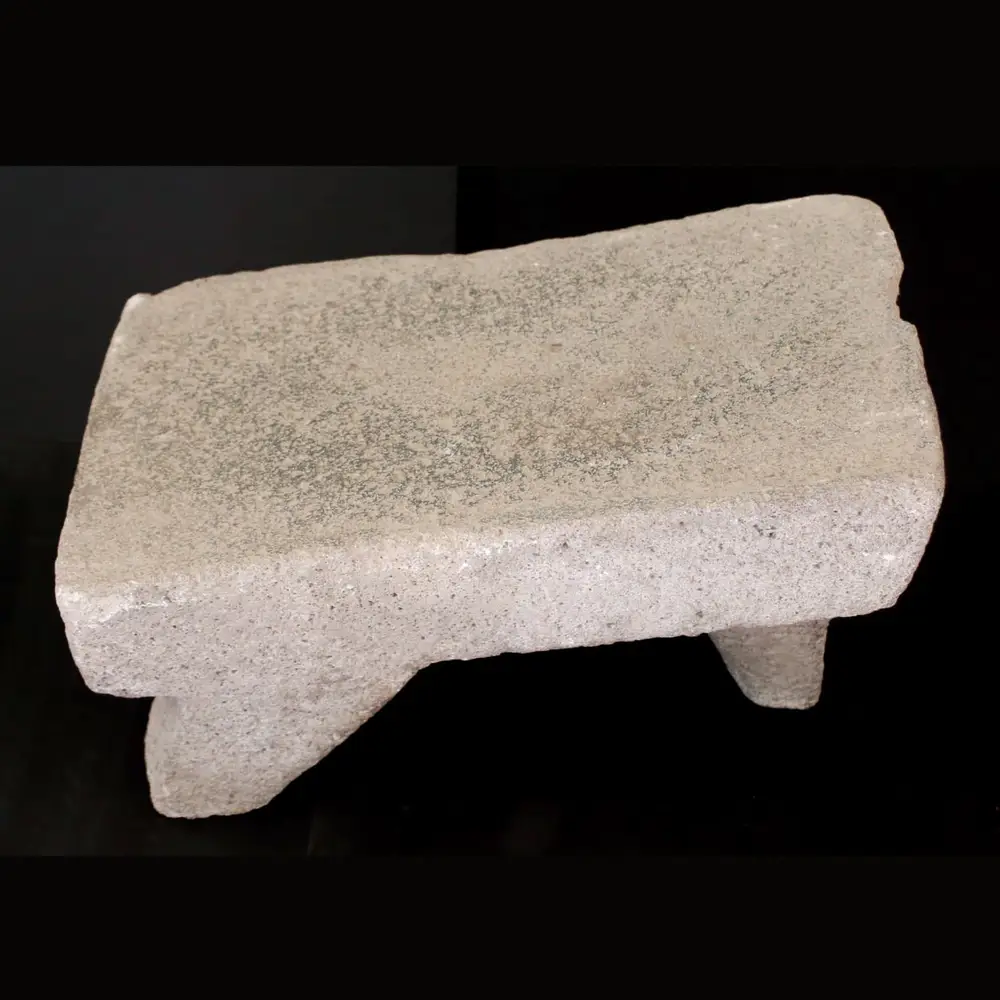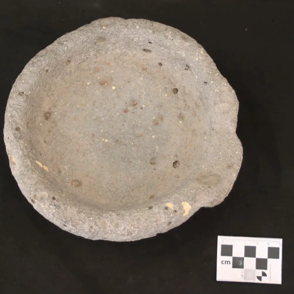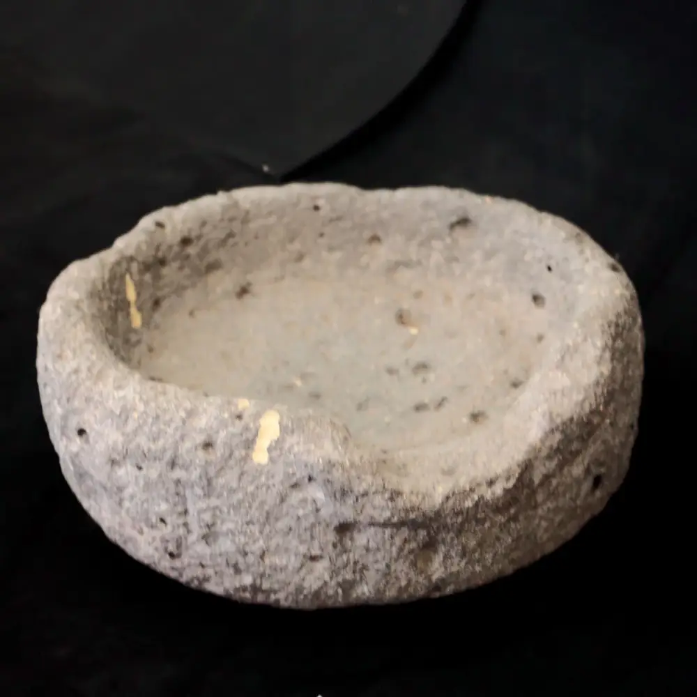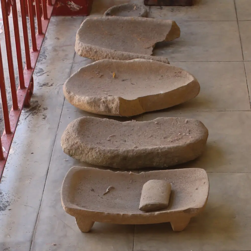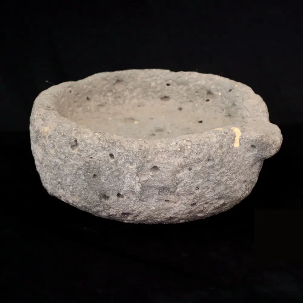 Molcajete y tejolote. Piedrastrabajadas con la técnica de tallado y pulido. El molcajete mide 24cm de diámetro y el tejolote 11cm de largo. Proviene de la colección Escuela Teresa Barba (REG1671 PJ 111). Hechos en piedra basáltica. Herramientas utilizadas en el procesamiento de alimentos.