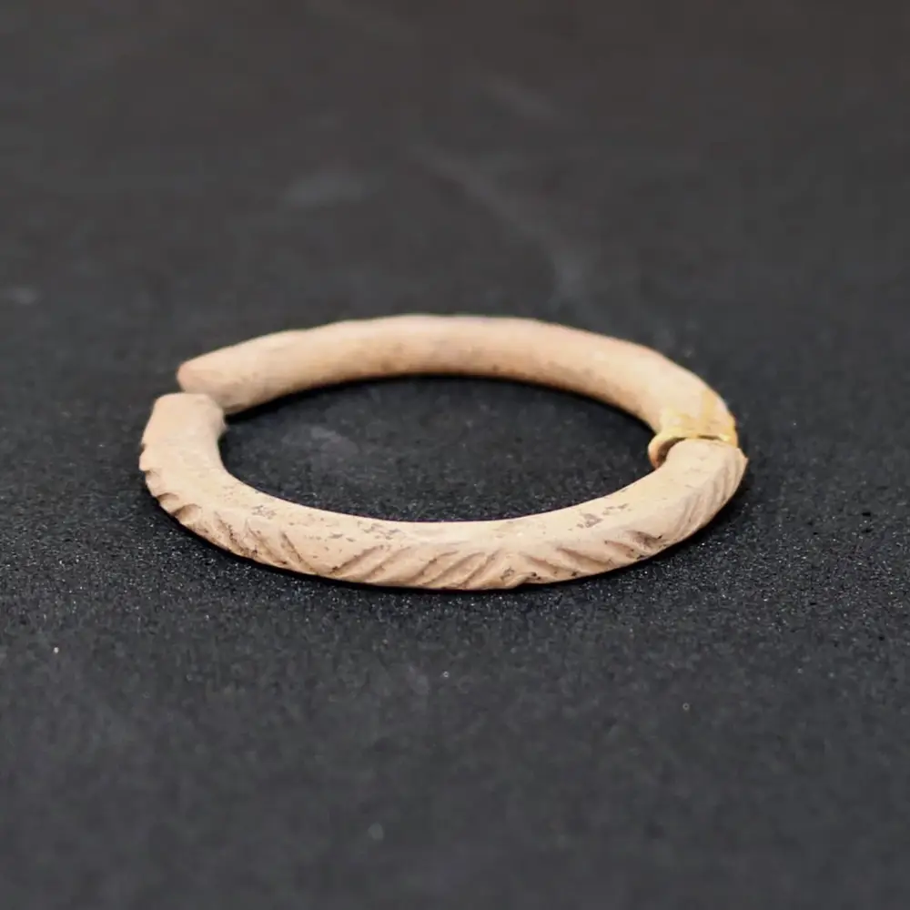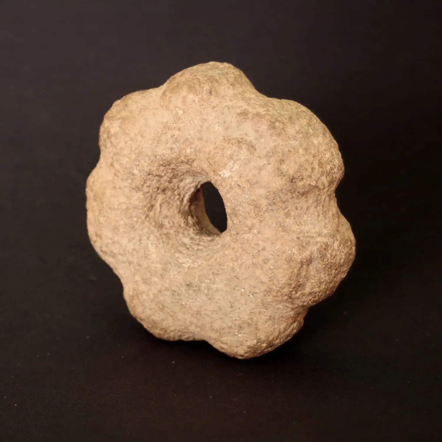 Narigueras. Concha Spondylus trabajada con la técnica de tallado y desbaste. Miden 4cm y 3.5cm de diámetro. Provienen de la colección Escuela Teresa Barba (REG-1671 PJ 162). Asociadas a la fase Amparo (300a.C. – 300d.C.). Las narigueras presentan el borde tallado y son de color anaranjado claro.