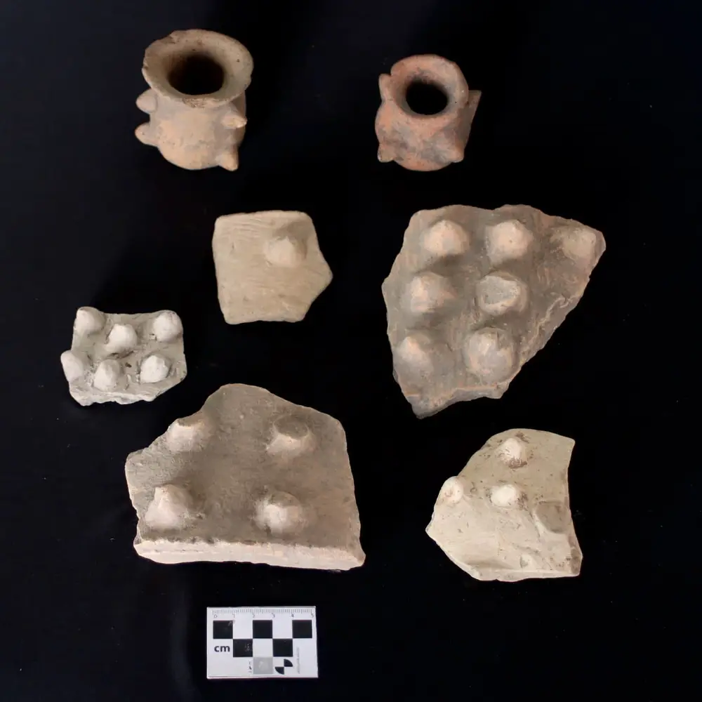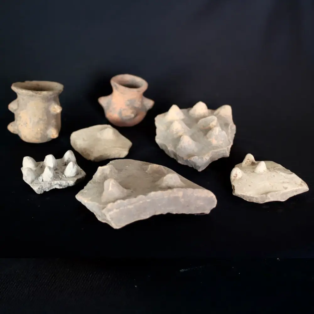 Bracero. Cerámica hecha con la técnica de barro enrolladoraspado y pastillaje. Mide 51.5 x 24.2 cm. Fue encontrado durante las excavaciones de la Estructura 5 de la Zona de Monumentos de Ixtapa (Mountjoy 2003: PV-1). Asociado a la fase Aztatlán (900 – 1200d.C.). Se caracteriza por las “espinas” en el exterior del bracero imitando a las del tronco del árbol avillo, pochote o la ceiba. La pieza es del color natural del barro café amarillento y se le aprecia un pequeño orificio en un costado para la ventilación interior. Cerámica de uso ritual.