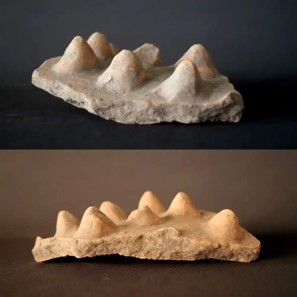 Sello Solar. Vistas lateral e inferior. Cerámica hecha mediante la técnica de barro modelado e incisión. Mide 6.2cm de largo, 3.2cm de ancho y 4cm de alto. Pertenece a la colección Escuela Teresa Barba (REG-1671 PJ 192). Asociado a la fase Aztatlán - Banderas (900 – 1600d.C.). Es de forma rectangular con mango en la parte posterior. El sello consiste de diseños solares en forma de “quincunce” hechos a base de círculos concéntricos al centro y enmarcado por cuatro volutas y líneas que forman los rayos solares.
