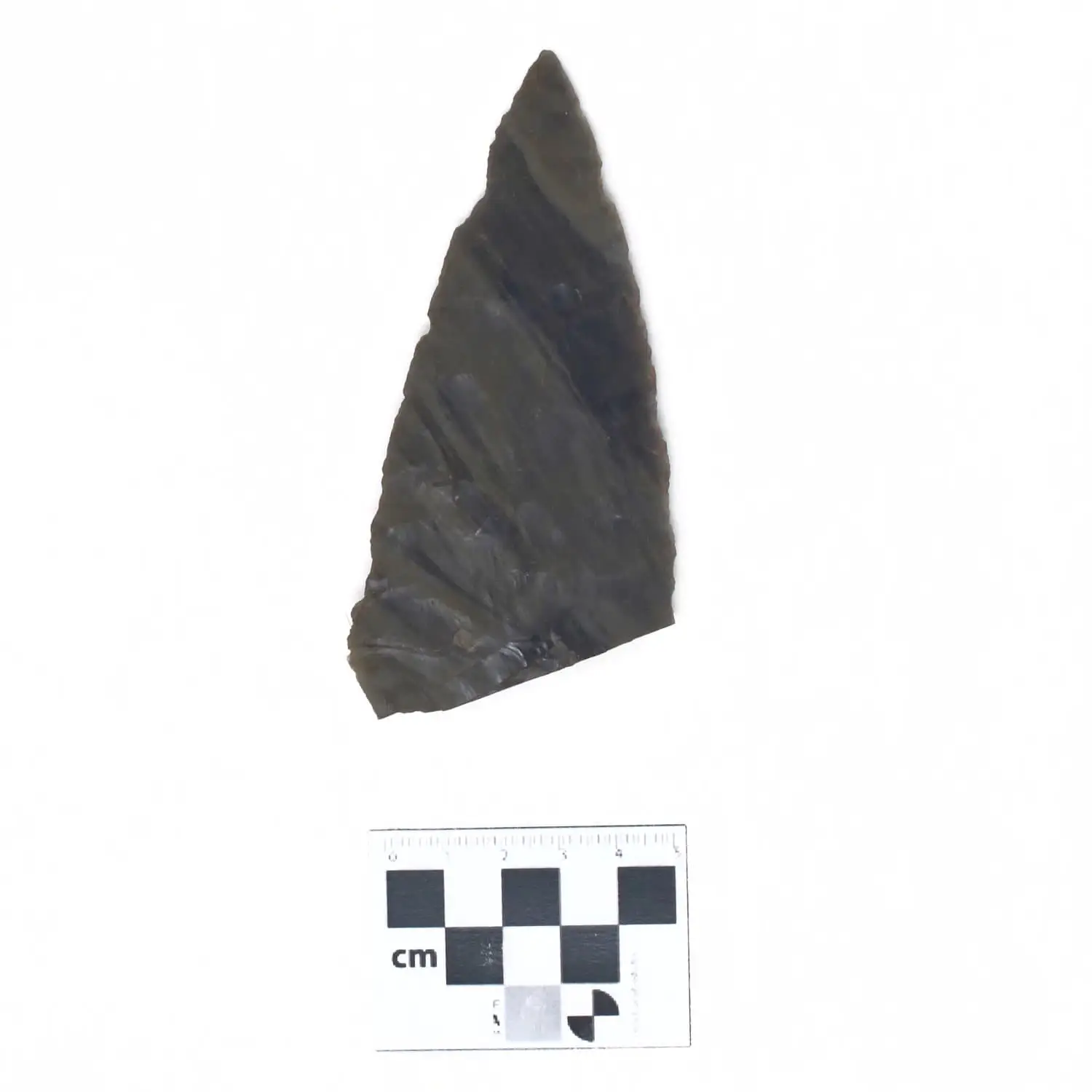 Hacha. Piedra trabajada con la técnica de tallado y pulido. Mide 20cm de largo y 9cm de ancho. Proviene de la colección Escuela Teresa Barba (REG-1671 PJ 136). Se puede apreciar que la zona del filo se encuentra pulida y la del enmangue desbastada para sujetarse. El hacha no presenta huellas de uso.