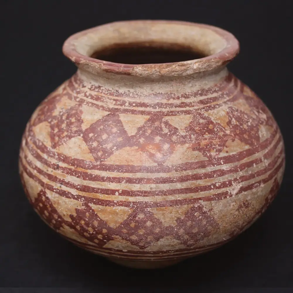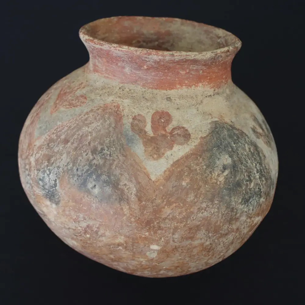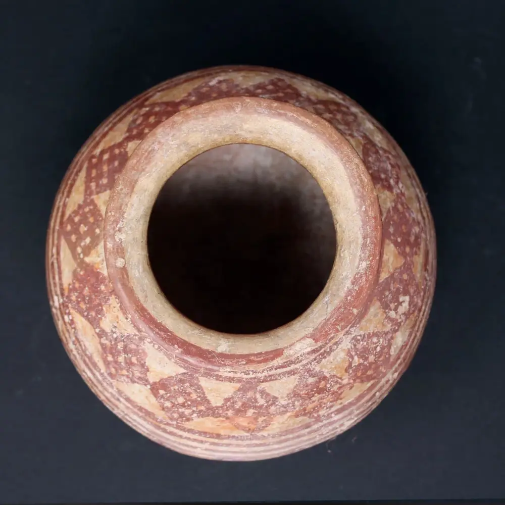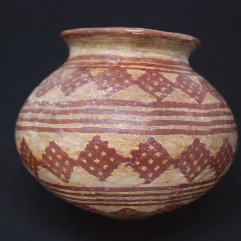 Olla Tesgüinera. Cerámica hecha con la técnica de molde, policromía y pulido. Mide 31.5 cm de altura, 28.5 cm de ancho y la boca de 12 cm. Proviene de la colección Escuela Teresa Barba (REG-1671 PJ 239). Asociada a la fase Banderas (1200 – 1600d.C.). Olla globular con decoración en bandas con diseños geométricos en color negro y rojo sobre un engobe café. Este tipo de ollas de cuello alto y boca restringida han sido asociadas a la producción de bebidas fermentadas como la cerveza de maíz, llamada tesgüino.SEMBLANZA
