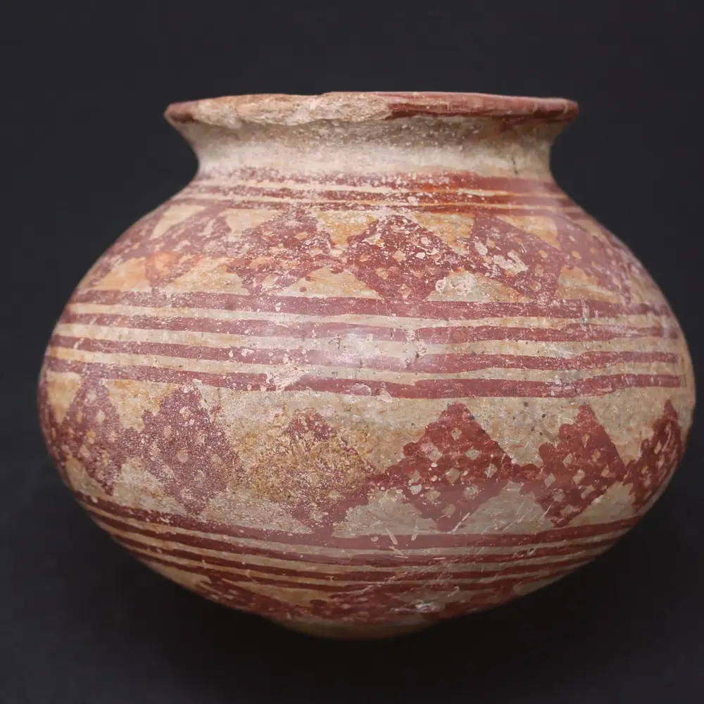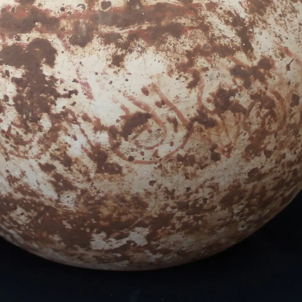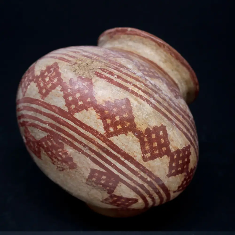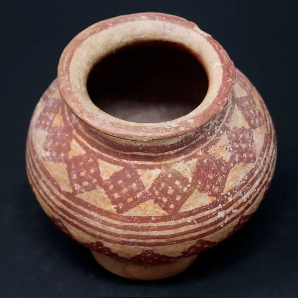Olla Tesgüinera. Cerámica hecha con la técnica de molde, policromía y pulido. Mide 31.5 cm de altura, 28.5 cm de ancho y la boca de 12 cm. Proviene de la colección Escuela Teresa Barba (REG-1671 PJ 239). Asociada a la fase Banderas (1200 – 1600d.C.). Olla globular con decoración en bandas con diseños geométricos en color negro y rojo sobre un engobe café. Este tipo de ollas de cuello alto y boca restringida han sido asociadas a la producción de bebidas fermentadas como la cerveza de maíz, llamada tesgüino.SEMBLANZA