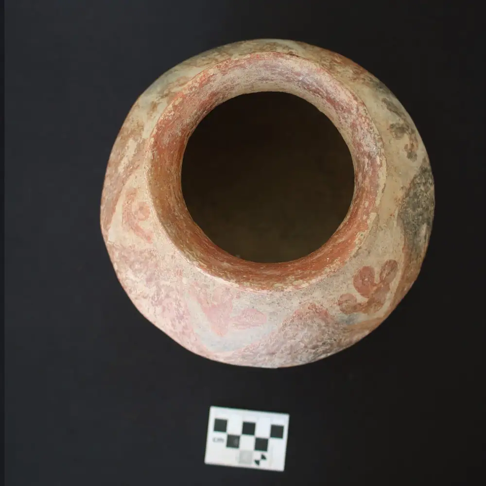 Sahumador sonaja. Vista superior. Cerámica hecha con la técnica de modelado, incisión, punzonado, pulido y bicromía. Mide aproximadamente 35cm de largo y la cazoleta 17cm de diámetro. Proviene de las excavaciones de la Estructura 5 de la Zona de Monumentos de Ixtapa y fue descubierto junto con otros incensarios y braseros dentro de un contexto funerario (Mountjoy 2003: PV 1). Asociado a la fase Aztatlán (900 – 1200d.C.). Está decorado con motivos en pintura roja sobre bayo característicos de la tradición Tolteca-Aztatlán. El fondo de la cazoleta presenta una perforación en forma de cruz para la ventilación. Cerámica de uso ritual.