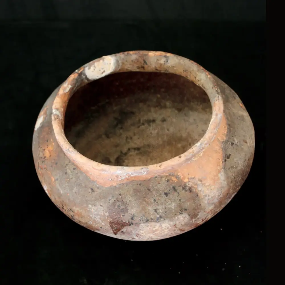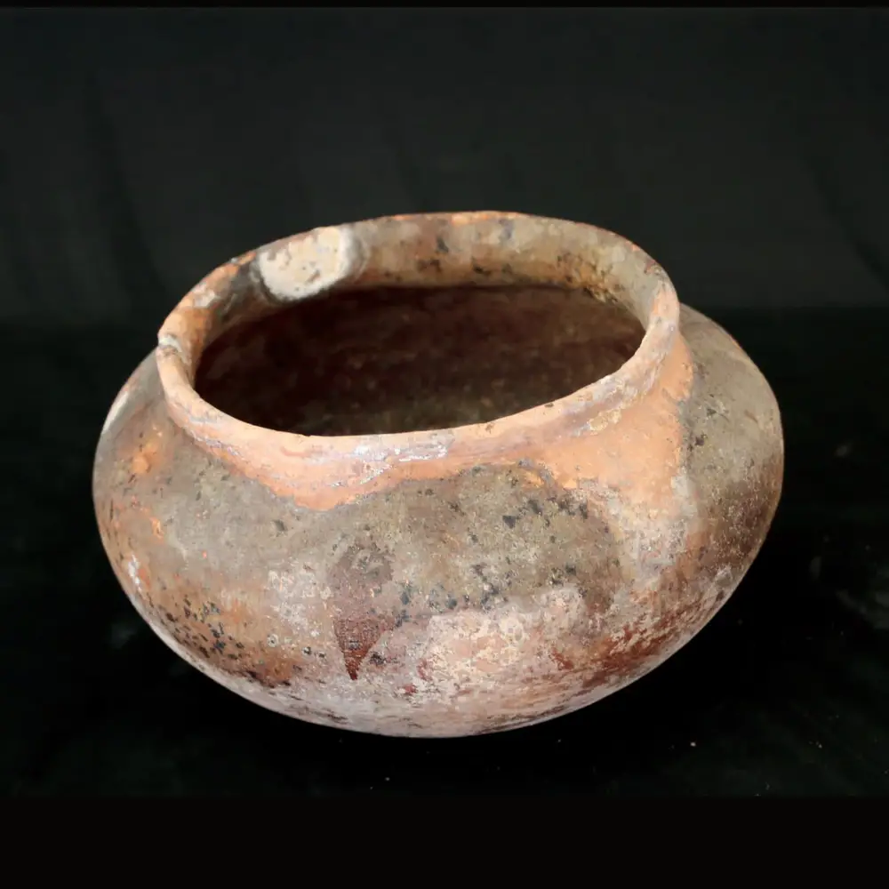 Olla Tuxcacuesco Inciso. Cerámica hecha con la técnica del barro enrollado y raspado, inciso, pulido y engobe. Medidas aproximadas de 9 x 12cm. Proviene de las excavaciones arqueológicas del sitio La Pedrera ubicado en una loma de la calle Costa Rica en colonia Emiliano Zapata (Mountjoy 2003: PV-28). Asociada a la fase Amparo (300a.C. – 300d.C.). La decoración es característica del estilo Tuxcacuesco ampliamente distribuido por la costa de Colima, Jalisco y Nayarit. Consiste de patrones en forma de triángulos y diamantes con el interior achurado con líneas incisas paralelas y perpendiculares formando “redes”. La vasija es de color rojo.