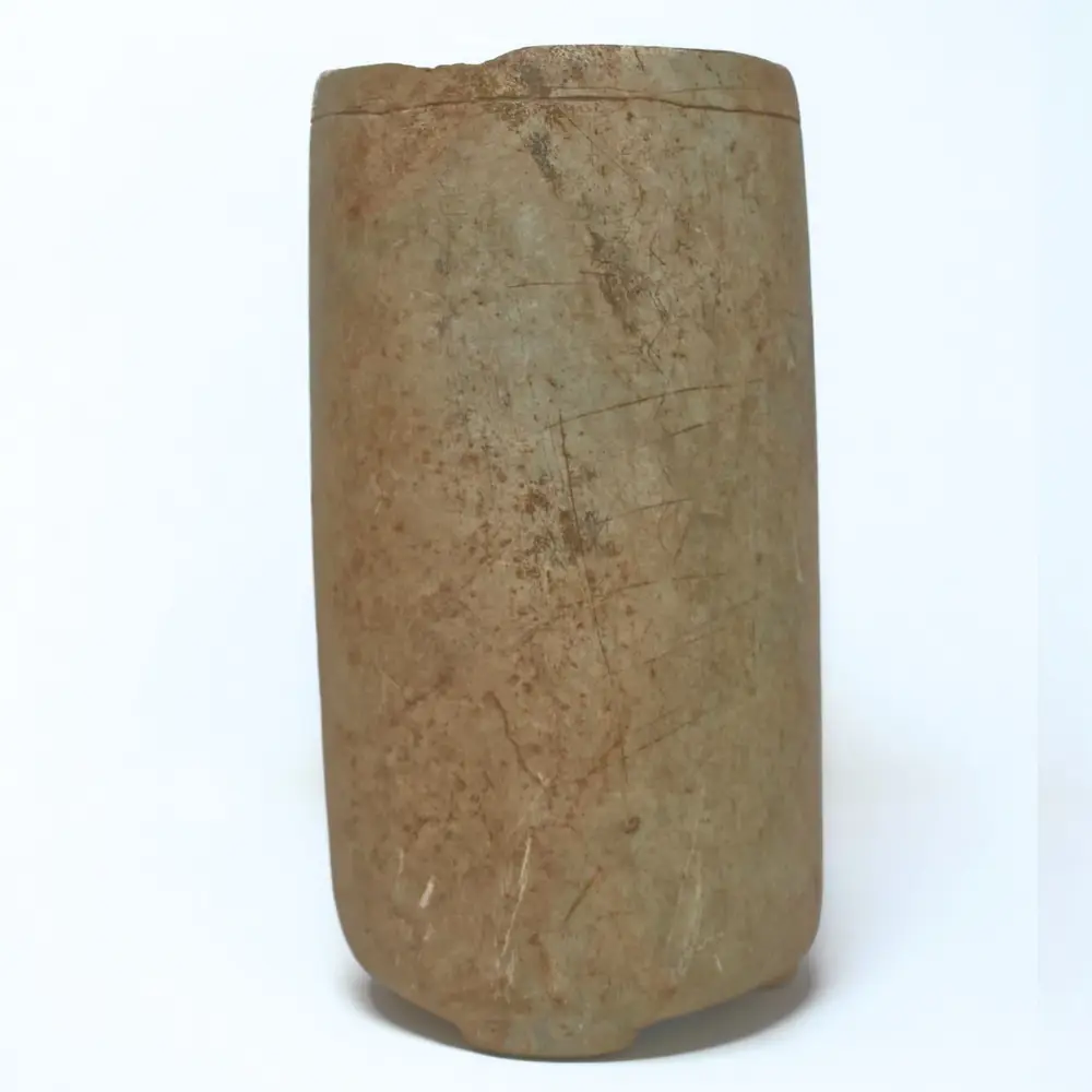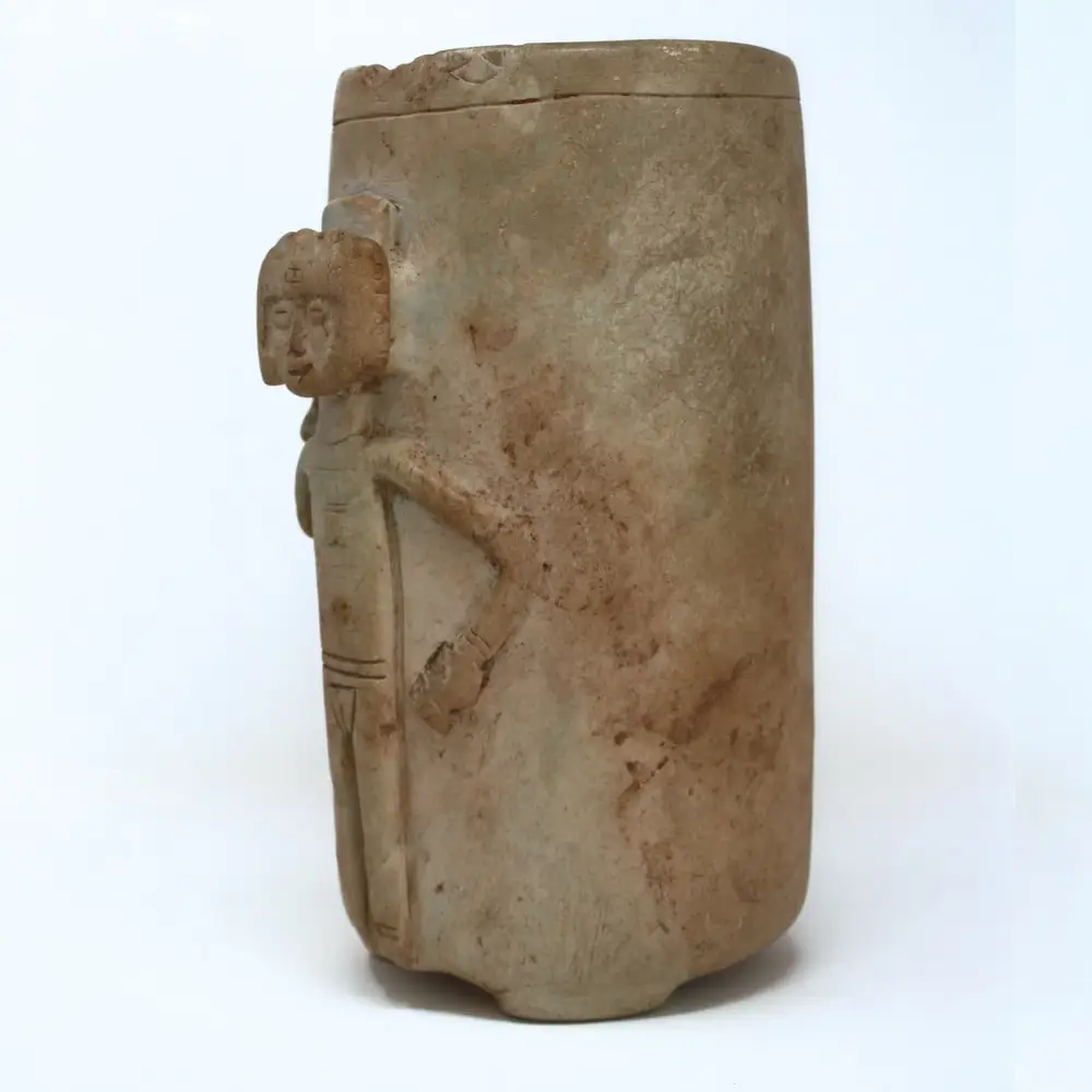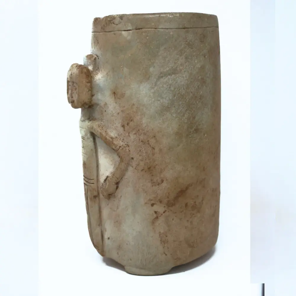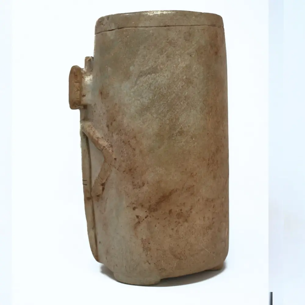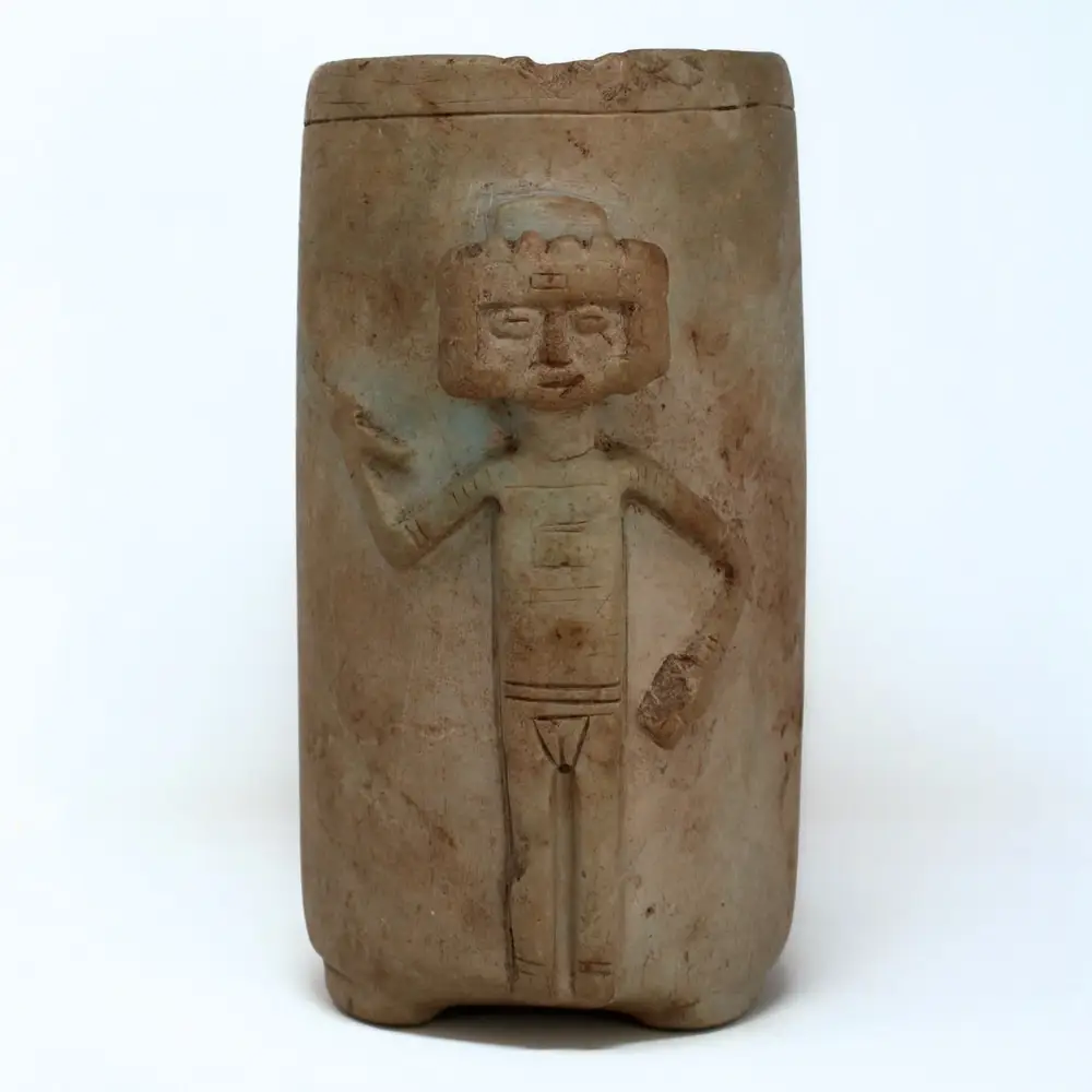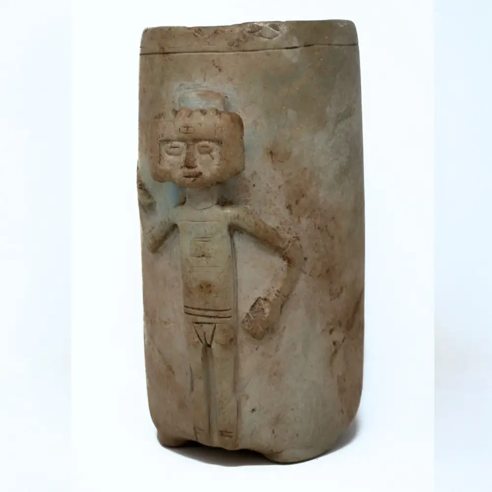 Vaso chocolatero. Piedra semipreciosa trabajada con la técnica de excavado, tallado, incisión y pulido, posiblemente alabastro. Mide 26.5cm de altura por 13cm de diámetro y paredes de 13mm de espesor. Proviene de la colección Escuela Teresa Barba (REG-1671 PJ 180). Asociada a las fases Aztatlán-Bandras (900 – 1600d.C.). Vaso trípode con figura antropomorfa femenina, tiene el cuerpo desnudo con los genitales resaltados, presenta la cabeza en bajo relieve con casco o yelmo decorado, sostiene en su mano derecha un artefacto parecido a una lanza o cetro, la mano izquierda se encuentra deteriorada. El vaso tiene un color crema con algunas tonalidades en color azulverdoso.